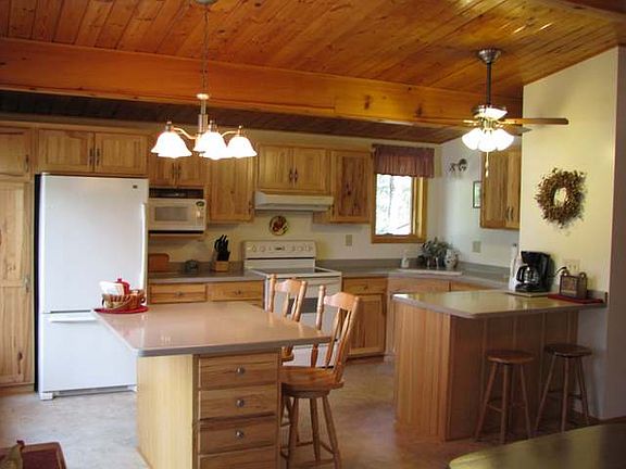 This home is ready to move into, it is an open living concept with bright living areas over looking Virgin lake! The kitchen has beautiful hickory cabinets solid surface counter tops and a wood floor which flows into the dining area. Vaulted ceilings accent the Kitchen,dining and living room. You will really appreciate the three season room and porches that seems to draw visitors closer.The lower level walkout is perfect for entertaining with a large living area with a wood stove, private bedroom and bath rooms. This home also features an attached 2 car garage and a single car detached garage along with a storage shed all on over 300 feet of water!
