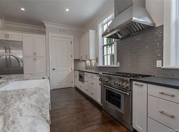 Luxury townhome with a private elevator in the heart of SouthPark. Limewashed exterior brick, covered paver patio open to tree save area, covered balcony, and 2 car garage with epoxy floor. Open floorplan with hardwood floors throughout (tile in full baths and laundry). Kitchen includes a 36" dual fuel Thermador range w/ hood, built-in Thermador fridge, marble and quartz countertops, tile backsplash, undercabinet lights, deluxe construction cabinets with dovetail drawers and soft-close door and drawers. Large master suite with walk-in closet and heated floor in master bath. Gas log fireplace, built-ins, crown molding, site-built closets, framed mirrors, dual flush toilets, Ring video doorbell, and tankless water heater. Part of the Environments for Living Program with an energy performance guarantee.