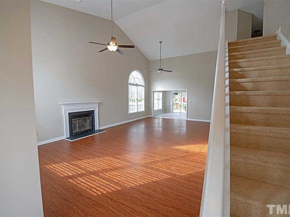 Beautiful transitional home in quiet North Ridge/North Raleigh. Cathedral ceilings welcome you into oversized gathering room with bright windows and warm fireplace. Updated kitchen and new appliances. First floor master with updated oversized shower in MB and walk in closet. W/D Utility room on first floor provide first floor living. Two bedrooms and full bath upstairs with large floored walk-in storage that could be converted to 3rd bedroom. Deck and patio provide outdoor living and fenced yard.