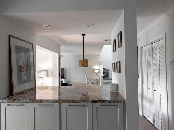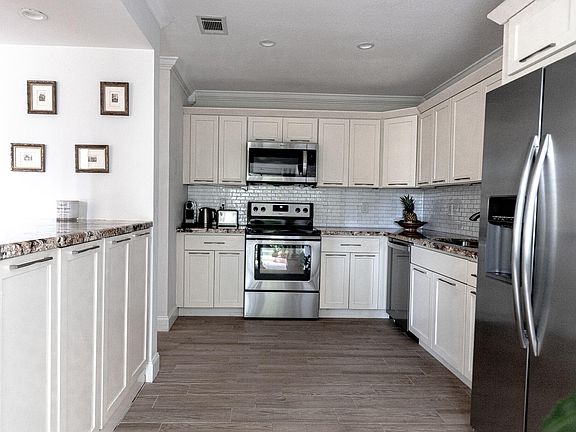 Connecting the living room and the kitchen is a high table with 4 chairs, perfect for breakfast! The kitchen has granite counter tops and appliances, beneath the kitchen island is a full washer and dryer. The dining area with a table for 6 opens up to the private backyard with sitting area and butterfly garden. The entire house has hurricane proof windows and sliding doors. There is a large storage behind metal doors in the dining area.