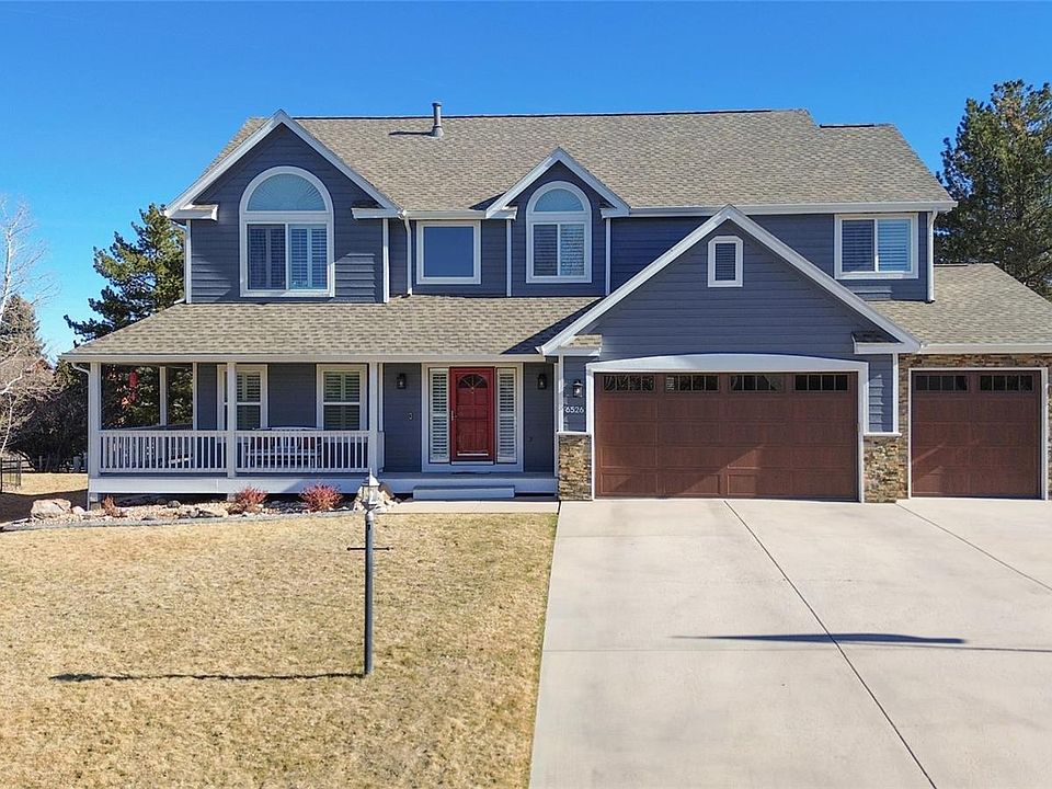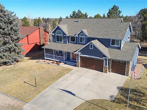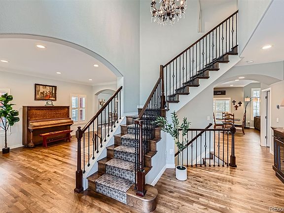 Welcome to this stunning 5-bedroom, 5-bathroom home located in the highly sought-after community of The Pinery. Situated on a spacious 0.3-acre lot, this residence blends elegance, comfort, and functionality in a serene, wooded setting. Upon entering, you're greeted by a dramatic open staircase and gleaming hardwood floors that extend throughout the main level. Plantation shutters grace every window, adding classic charm and refined privacy. The main floor offers a formal dining room with access to a peaceful front patio, a formal sitting room, and a spacious living room with a gas fireplace and oversized windows that flood the space with natural light. The gourmet kitchen is a chef’s dream, featuring white cabinetry, stainless steel appliances, and a tasteful backsplash. Just off the kitchen and garage, you'll find an oversized mudroom and a laundry area with a built-in dog door and access to the backyard. Upstairs, retreat to your luxurious primary suite with a five-piece spa-style bathroom, marble finishes, dual vanities, a soaking tub, glass-enclosed shower, and walk-in closet. Three additional bedrooms offer plush carpet, walk-in closets, and easy access to well-appointed bathrooms. The finished basement is an entertainer’s dream or the perfect guest suite, with a custom bar area, additional family room, bedroom with en-suite bath, and a large storage room. Step outside to a private backyard oasis—ideal for Colorado evenings around the firepit or playtime on the built-in playground. Enjoy outdoor living year-round on your covered Fiberon Deck (2016) surrounded by mature pines. Located in The Pinery, known for its natural beauty, wildlife, golf course, and miles of trails, this home offers more than just a place to live—it’s a lifestyle. Major updates include a Class 4 impact-resistant roof (2024), exterior paint and garage doors (2023), water heater and shed (2022), new windows (2021), and a whole-house fan (2020) and plenty more!