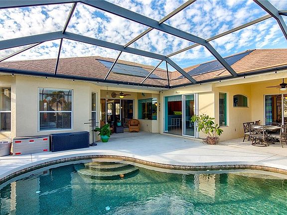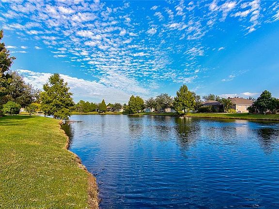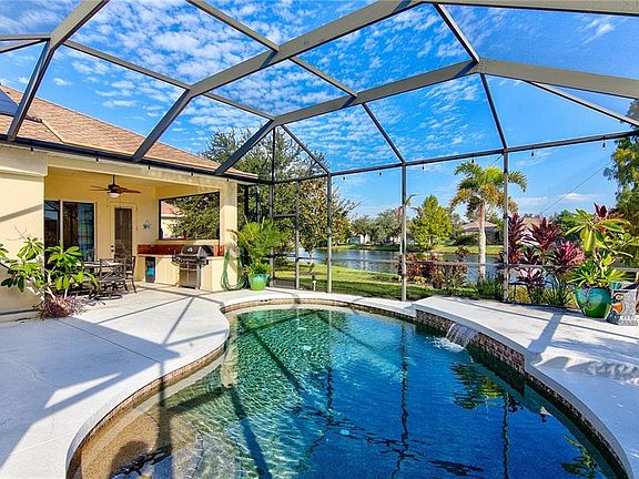 You will fall in love with this house twice! First, when you pull up to the bright home that is surrounded by a large yard, beautiful landscaping and lush trees. Next, when you step inside to find a formal living room and dining room featuring tray ceilings, classic columns and a direct view of the lakefront. The large kitchen has a separate pantry, breakfast bar and space for another dining set. The sun-filled family room features sliding doors opening directly to the patio, perfect for bringing the fresh air inside! All 4 bedrooms are spacious especially the Master Suite with a walk-in closet and spa-like bathroom complete with soaking tub. This impressive property has a peaceful water view you will enjoy from your screened-in covered patio and outside dining area. The outdoor kitchen and sparkling pool are ideal for hosting your friends and family! There are many upgrades that make this home stand out among the rest including brand new dishwasher, new microwave, new A/C unit, all new carpets and new solar pool equipment and system to name a few.