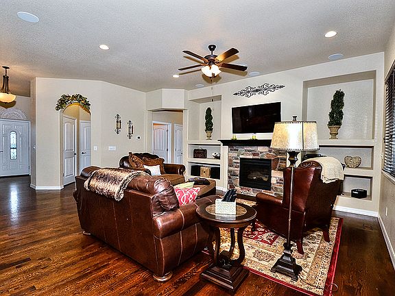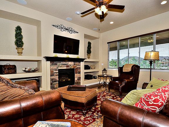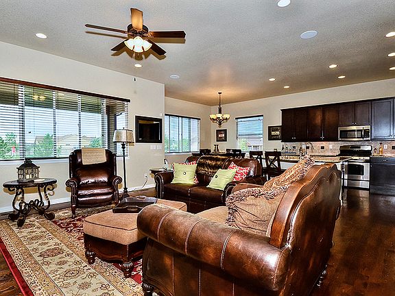 Driving up to this exquisite ranch style home with upgrades before you walk in the door. Fantastic main level living with Great room and a wall of windows brings the outside in. Custom touches throughout. Beautiful hardwood throughout most of the main level. Gourmet kitchen includes gas cooktop, 42" cabinets, granite countertops, pantry and large island. Easy access to outside covered patio (12' x 26') with pikes peak views and huge backyard. Gorgeous great room ideal for entertaining. master bedroom, 5 piece bath, his and her walk-in closets. Master bathroom shower has a bench and shelf enclosed in the frameless shower. Light & bright study off the entry and laundry complete the first floor. Downstairs you will find a large family room, 2 additional bedrooms, full bath and unfinished work out/storage room. Make sure to note the huge lot and 3 car garage for plenty of storage.