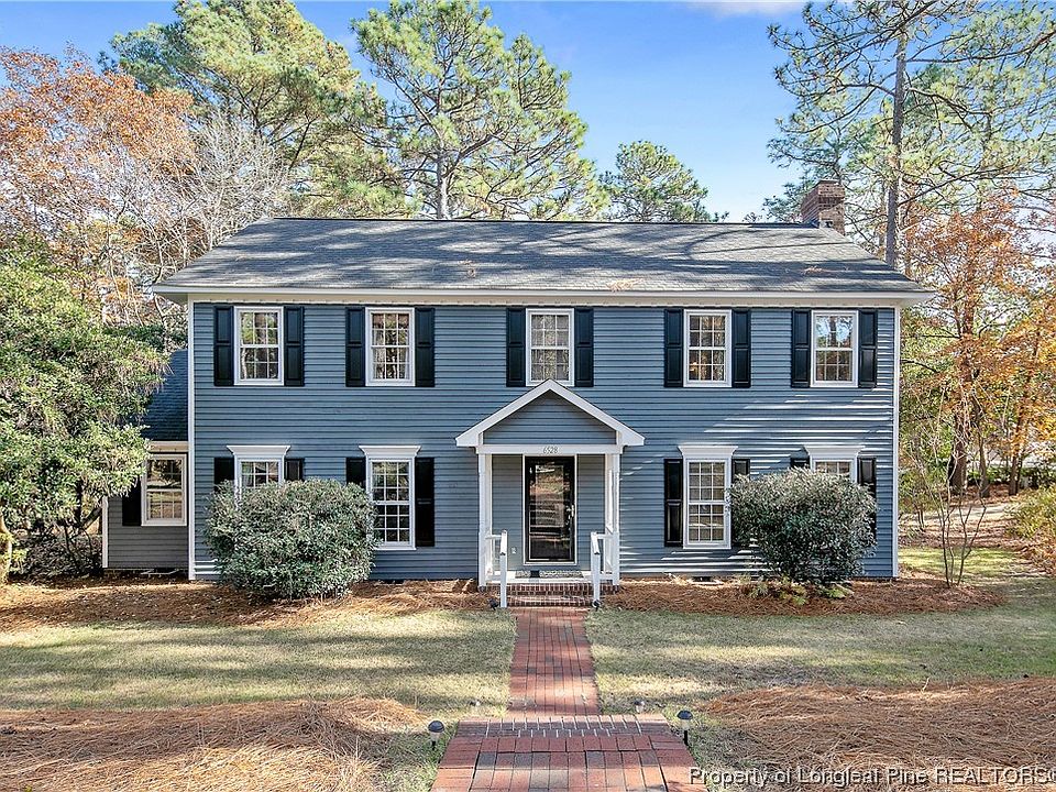 Beautiful, well maintained home in Woodbridge! This quiet neighborhood is located across from Pine Forest High School in North Fayetteville, about 10 minutes from Fort Liberty. This home offers 4 bedrooms and 2 bathrooms upstairs. Downstairs there is a large eat-in kitchen with custom cabinets and granite counter tops. The breakfast nook over looks the backyard. A beautiful sunroom with parquet floors is off the large living room. The living room makes a statement with wainscoting, built-in bookshelves and fireplace. There’s also one half bath downstairs, a formal dining room complete with wainscoting and hardwood floors and a flex space for an office, playroom or additional bedroom space! Great side porch and side entry 2 car garage. Driveway leads to cul-de-sac. Enjoy sitting on the large deck in the backyard located off the sunroom. Exterior recently painted! Roof was replaced 2014. Upstairs HVAC 2014, downstairs HVAC 2022. Water heater 2013. Septic was pumped 2019. NO CITY TAXES!