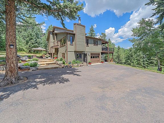 Idyllic south-facing setting offers privacy and touches 80 acres of Arapahoe National Forest. Enjoy a vastly remodeled home at the end of a cul-de-sac. A level driveway will bring you to the home and you will appreciate the usability of the land, large driveway area and views. The main level of the home offers hardwood flooring throughout. The great room is the ideal spot for gatherings and has a wood-burning fireplace, vaulted ceilings and distant views of the forest beyond. The remodeled kitchen has a gas stove, island with barstool seating and opens onto the deck. Outdoor living is at you fingertips with the 2-year old large deck that has a a covered portion with TV (not included) as well as sunny areas too. The deck has stairs to the patio level so this really is the ideal outdoor living home. Moving back inside, the main level offers 3 bedrooms including the primary suite. The Suite offers views and has a private, remodeled bath. The other bath on this level is also totally remodeled. The lower level has versatile spaces. A family room has a wood-burning fireplace and has space for TV watching and game table. A cozy bedroom walks out to the back yard while a larger den (currently functions as an additional bedroom) could be a hobby room, workout space or office and also has outside access. A new 1/2 bath is also on the level. The attached garage is ideal for 1 car or storage and there is plenty of additional parking for your RV and extra cars. Enjoy hi-end split AC in the great room for those warm days. The land is level with greenhouse, shed and so much space for riding bikes or playing with 4-legged animals. Just minutes back to the schools and rec center. Move in ready, light and bright and sunny location.