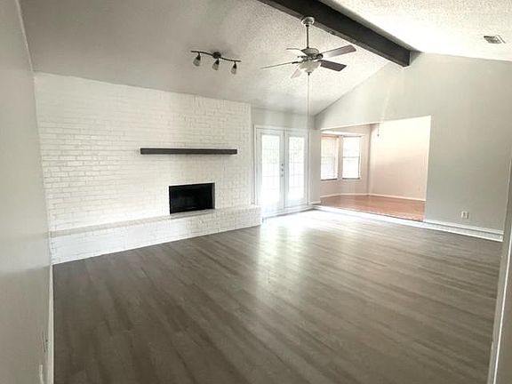Floor-to-ceiling brick fireplaceNewly updated homeExpanded patioGranite countertopsShade treeSoaring ceilingWalk-in closet