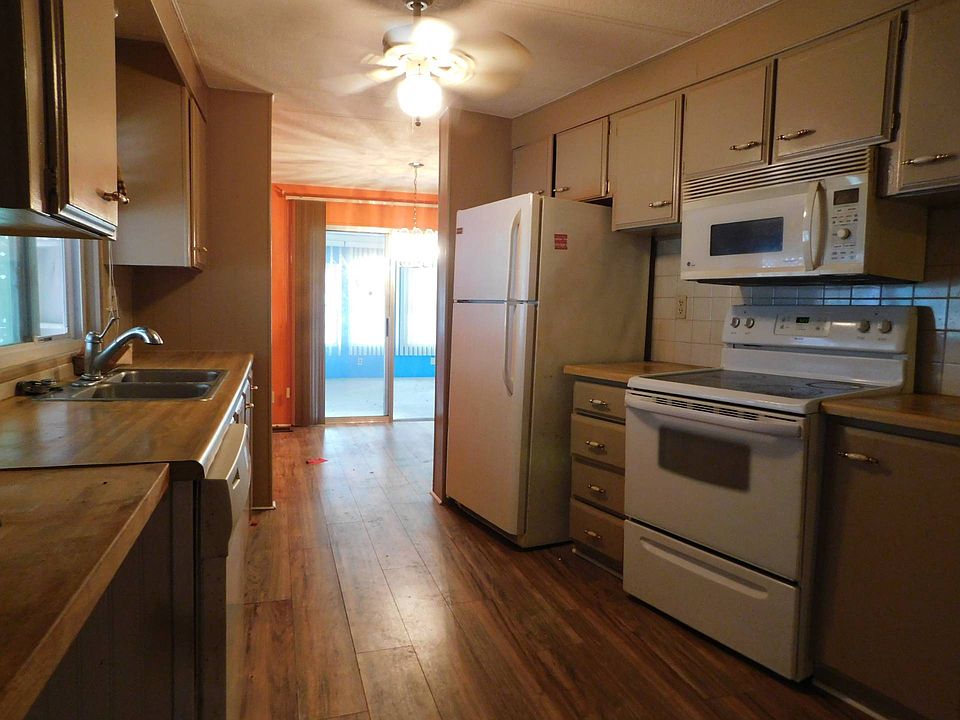 This is a very spacious doublewide that needs some tender loving care. It has a very large tempature controlled enclosed Lani opening into a roomy living room with large windows and attached dining area. The pass through kitchen comes with stove, microwave, refrigerator and dishwasher. Master bedroom has ensuite bathroom with step in shower and oversized closet. Guest room has built in closet and drawers. Hall bath is also a step in shower. Outside a very large screeded in carport, parking for 1 vehicle only and if your handy and want a work space this is the place. Laundry with large storage/work area is a must see. This home does need some work so call to for a guided tour.