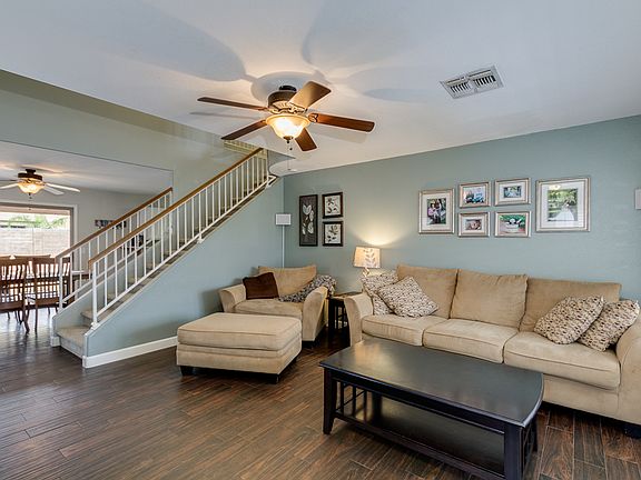 Updated & Upgraded spacious home w/ modern touches in a enclave of 57 homes w/ scenic beautiful mountain views. Newly installed wood look plank tile flooring & 4'' baseboards.Extra large Kitchen: freshly painted white kitchen cabinets w/ granite counters, stainless steel appliances (including a double oven), breakfast bar & walk-in pantry! Living room & dining area are large & open, featuring a custom built-in entertainment center w/ wired surround sound . Light & Bright: Lots of windows & plantation shutters throughout! 1/2 bath & large laundry area downstairs .4 large bedrooms & 2 bathrooms upstairs. New A/C 10/2017.Oversized backyard w/ covered patio & room for a pool. Great location & easy access to freeways, shopping, schools, popular parks, hiking trails & CCV.