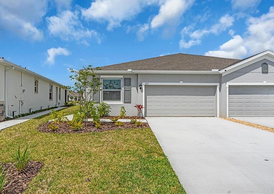 Eager for it's next owner- Enjoy the convenience of a brand new, move-in ready villa without the wait! Seller is offering $8,000 in closing cost credit to the buyer. This charming one-story layout boasts an open-concept design with a two car garage. The kitchen features a spacious granite island and high-quality stainless steel appliances. The great room opens up to a covered lanai, perfect for extending your living space outdoors. Enjoy your morning coffee with a beautiful view of the water. The current owners have only been in the home for three months - still covered by most of the builder's extended warranty - you can have peace of mind. At the back of the villa, you'll find the tranquil primary bedroom, complete with a generous walk-in closet and en-suite bathroom. Towards the front, the second and third bedroom share the second bathroom. This villa does come with blinds, washer, and dryer - another cost you do not have to worry about! Community offers a neighborhood pool and playground.