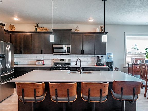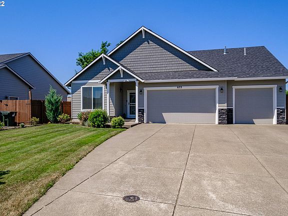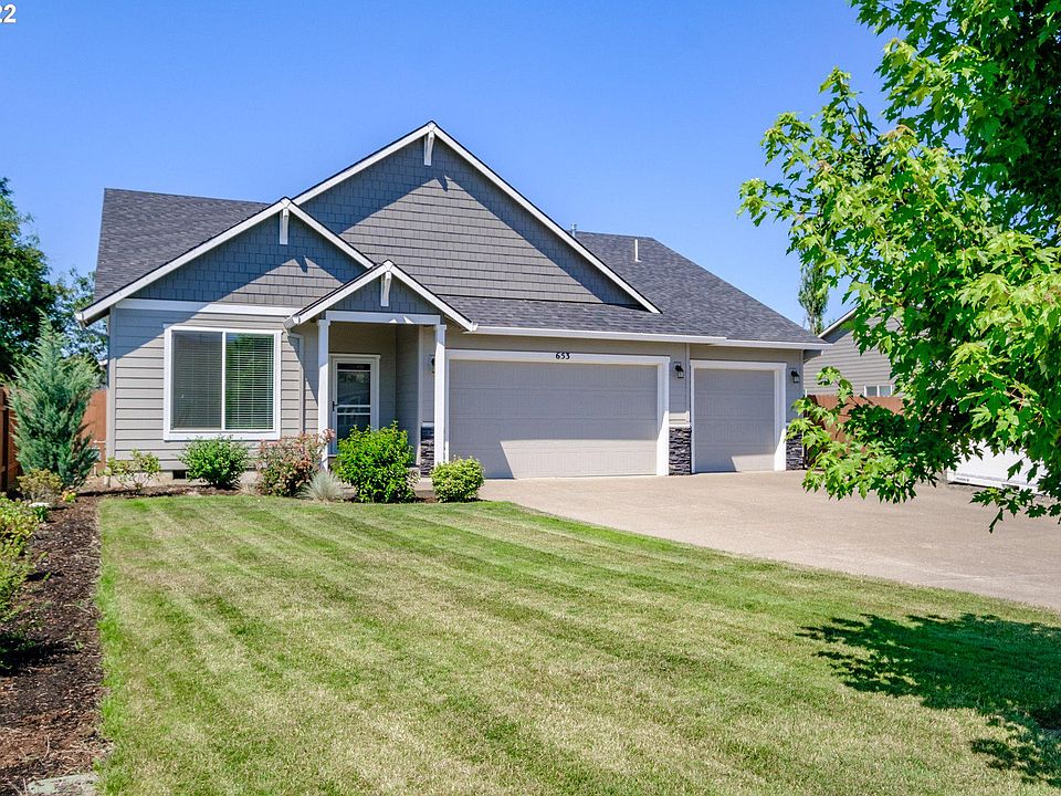 This highly desirable 1 level, 4 bdrm home has a gorgeous yard, huge RV spot and three car garage with room for all the toys! Located on a cul-de-sac with similiarly cared for homes. Enjoy the open floor plan with vaulted ceilings, coved hallways, gas fireplace, laminate flooring & wood wrapped windows. Kitchen has craftsman styled cabinets, quality stainless applainces, quartz counters &gorgeous island/breakfast bar. Primary bedroom w/nice sized walk in closet and double sinks. Covered patio!