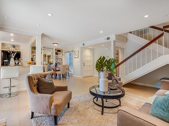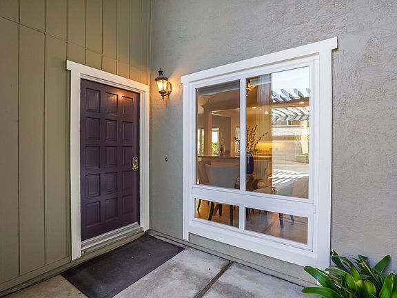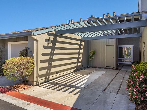 On a cul-de-sac. Flowering bushes line the drive. Impressive, bright living room. Hardwood floors and crown molding. Open floor plan. Recessed lights. Glass doors open to colorful back patio. Study area has built-in desk, shelves and cabinets, quartz counter. Kitchen with wide serving counters, eat-at counter. Quartz counters. Farmers sink under window looking into flowery garden. Recessed lights. Cheery stable door from kitchen to back garden: Pick fresh herbs at any time, or harvest some flowers for the dining table. Half bath on main floor. Plantation shutters on windows. Crown molding in both bedrooms. One bedroom has a personal balcony overlooking the rear yard. Hall bath has tiled shower over tub and a skylight. Double pane windows. Extra storage with pull down ladder in garage. Shell Cove features beautiful grounds with children's playgrounds and lagoon walkway, pool, spa, clubhouse, tennis courts. Steps from Seal Slough (leading directly to Bay Trail) and Shell Cove Park.