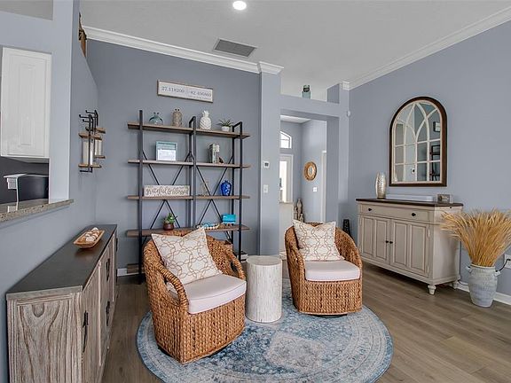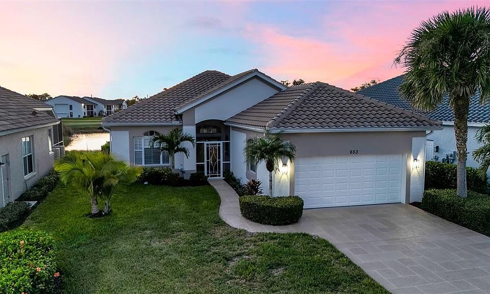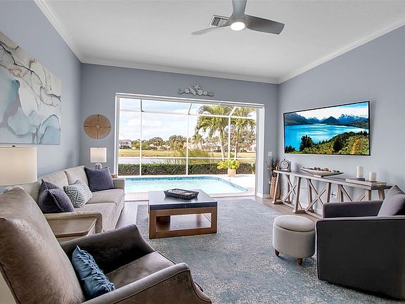 Experience the best of Florida coastal living in this beautifully updated maintenance-free pool home overlooking the 12th tee at Capri Isles. With tranquil pond and preserve views, this home blends comfort, style, and effortless everyday luxury. Inside, an airy coastal ambiance welcomes you — soft blue walls, crown molding, and plantation shutters set the tone for relaxed sophistication. The open layout flows seamlessly from the granite kitchen with stainless-steel appliances to the spacious living area, where sliders open to the screened lanai and sparkling pool. Enjoy west-facing sunsets from the pool with color-changing lights, framed by golf course views. The primary suite features custom closets, blackout drapes, and a spa-like bath with a soaking tub and tile floors. Thoughtful updates include new roof (2024), mohawk wood floors in bedrooms, epoxy garage floors with shelving, attic storage, new stamped concrete in the driveway (2025), fresh exterior paint (2025), and AC (2018). Hurricane panels and accordions provide peace of mind. Just minutes from Venice Beach, downtown shops, and dining, this home embodies the quintessential Venice lifestyle — golf in the morning, sunset swims by evening, and coastal breezes all day long.