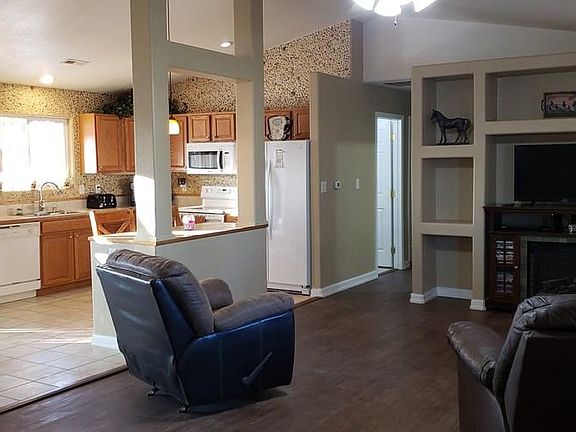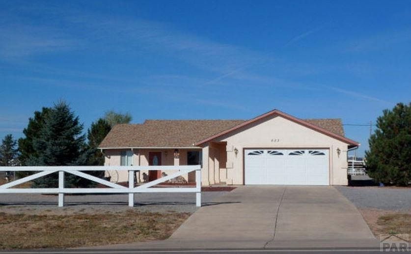 One level living with open floor plan, large rooms & split bedroom design. Solid surface floors throughout! Large master bedroom with a full bath, laundry/mudroom coming in from the garage. Nice big open kitchen with island, dining room has sliding doors that open to the fenced back yard. Custom rock wall art in the bathrooms and kitchen. Set up for horses with 4 rail vinyl fencing, two 10 x 18 loafing sheds, plus a 12 x 16 storage shed. RV hookup and parking, close to all the Pueblo West amenities plus easy access to I-25. New paint, wood plank vinyl flooring and new trim. Great mountain views!!