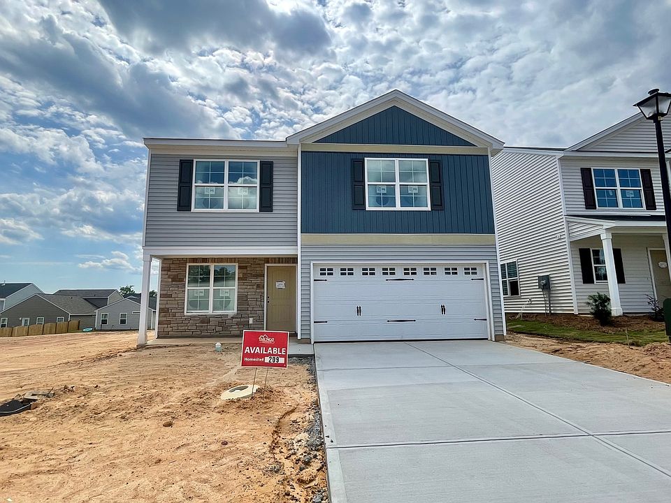 This Meriwether plan is a beautiful four bedroom, two and one-half bath home with an office with French doors! When you enter the home you will first notice the office to the left, with Oyster Oak luxury vinyl plank floors running throughout the main level and the light grey walls throughout the home. Just down the hall is the open concept main living area. The kitchen is warm and inviting with white shaker style cabinetry, large island with Luna Pearl granite overlooking the great room that is anchored by a gas log fireplace. Upstairs there are three great size secondary bedrooms, two with walk-in closets and all with ceiling fans, a large secondary bathroom and upstairs laundry that is connected to the primary closet. The primary bedroom features a ceiling fan, dual vanity, huge walk-in closet, separate soaking tub, shower and a water closet. You will enjoy the outdoors all year long on the covered rear porch, front porch, and irrigation in the front yard. Ask about seller guaranteed rate lock on this property! Come out and see today!