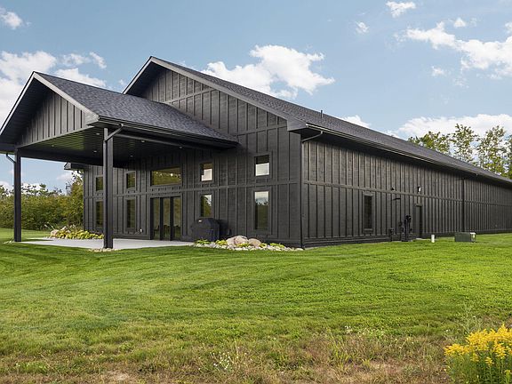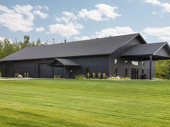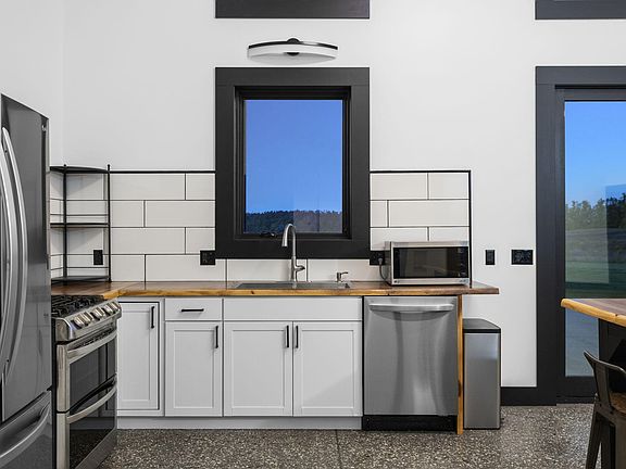 Remarkable 3-bed, 2-bath Barndominium on 60 acres, featuring in-floor heating and elegant exposed aggregate flooring. Enjoy a breathtaking view from the 6,000 sq ft living space, with 4,300 sq ft dedicated to recreational use—ideal for car storage, sports training, or your own unique vision, complete with a dry sauna and axe throwing area. The structure offers (2) 12x16 overhead doors and soaring 16' sidewalls with a peak ceiling height of 23'. Additional heated 60x30 garage area with a 28x40 covered pavilion for campers, tractors and the like. Nestled in picturesque rolling hills, this private retreat boasts meticulously landscaped and irrigated grounds, complemented by fiber-optic internet. A truly unique combination of modern amenities and serene rural living.