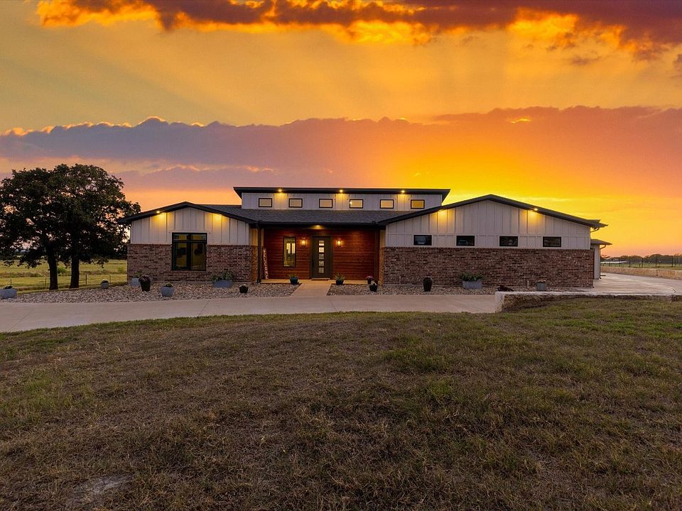 Sitting atop a hill, imagined and built by True Texas Builders, a gorgeous estate which is the pinnacle of contemporary country living. This 3049 sqft home is on 2.5 acres and includes a 4 bed 2.5 bath, 2.5 car Garage main house with a 1200 sqft full pool house. You will find custom doors, oversized large format tile floors, high-end light fixtures and an 82 in. linear fireplace. The kitchen is equipped with GE Cafe Appliances, including an induction cooktop. french door style oven, sparkle quartz countertops, frameless cabinets, high end hardware. The rear features an oversized back porch, a pool and full pool house. The highlight of the outside is the pool house that can be closed for privacy or fully open. Within a matter of seconds, the THREE triple glass, tinted 10X10 Overhead doors will open up to host the most amazing events you could ever dream of. This home is truly a must-see, entertainers dream and an opportunity of a lifetime.