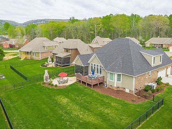 Breathtaking views of the scenic mountains from one of the best backyards in the neighborhood while enjoying the outdoor fireplace. This open floorplan home, built by Andrew Miller, offers an abundance of amenities from its fabulous location, to its quality and exceptional attention to detail. Located in the desirable community, Canyons at Falling Water, with pool and a great place for walking and riding bikes! Three sided brick home with three car garage, covered front porch, 11' X 14'+/- screened porch , 18' X 12' deck, and a large stamped patio with fireplace. Foyer has hardwood flooring and arched doorway that leads into the kitchen and great room. Formal dining room with hardwood flooring and an abundance of trim work. The kitchen offers oversized island with bar, granite counter More...tops, stainless appliances, and five burner gas range that completely opens into the great room. The huge great room offers lots of windows for natural lighting, built-in bookcases, and hardwood flooring. Main level master and master bath has two vanities tile shower, and large walk-in closet. There is an additional bedroom with hardwood flooring and full bath on the main level. Upper level includes one bedroom with private bath, a second bedroom with full bath, loft, and about 300+/- square feet of unfinished walk-out storage. Other interior features include, custom cabinets, granite counters, delta oil rubbed bronze plumbing fixture, security system, central vac, garage utility sink, Pella aluminum clad windows, all bedrooms have walk-in closets, and tankless water heater with a recirculating system. Exterior features include private and fenced backyard, full yard irrigation system on a separate meter, landscape lighting, and fescue sod.Convenient to Highway 27, Downtown Chattanooga, lake, parks, outdoor recreation, restaurants, Northgate Mall, and much more!!!