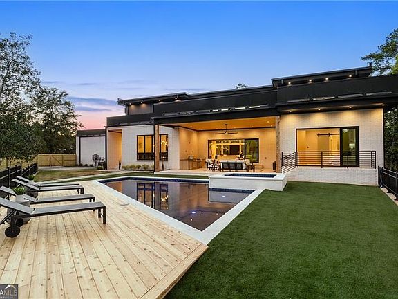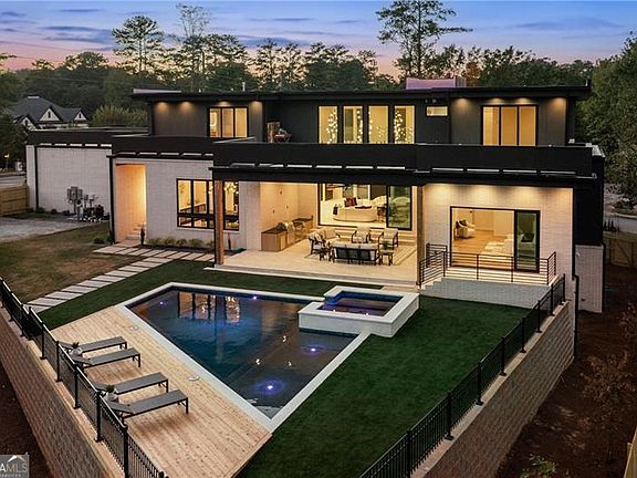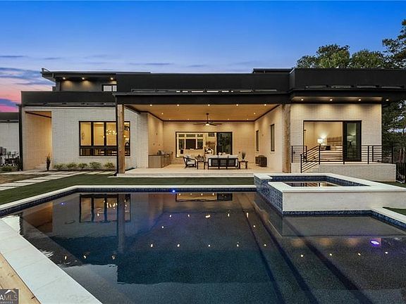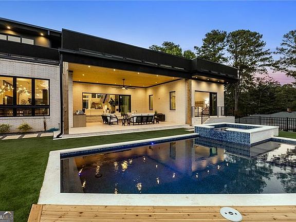 Welcome to this extraordinary modern estate, an architectural gem with a bold flat roofline, rooftop balconies, and an interior that radiates sophistication and style at every turn. Spanning multiple levels, this one-of-a-kind residence features a striking open floor plan, anchored by a two-story great room with floor-to-ceiling windows and a linear gas fireplace. The heart of the home is the chef's kitchen that is nothing short of world-class: fully equipped with Sub-Zero and Wolf stainless steel appliances including double ovens, dishwasher, a dramatic 6-burner gas range, custom-crafted wood cabinetry with LED lighting, a full coffee station, and wine refrigeration. A modern floating staircase with glass railings ascends to the upper level, where you'll find four expansive bedrooms, each with beautiful custom tile design en-suite baths and custom walk-in closets. The primary suite on the main floor offers a gorgeous bathroom with dual sinks, custom tile, soaking tub and walk-in custom closets with LED lighting that is the epitome of luxury in closet design, blending privacy with indulgence in a space designed to soothe and impress. An additional main-level bedroom or executive office adds versatility and convenience. The main level showcases 48x48 custom designer tile flooring, while wide-plank hardwoods bring warmth and elegance to the primary bedroom and upper level. A fully equipped second kitchen-complete with a gas range, refrigerator, sink, and dishwasher-offers added flexibility for entertaining or extended living. The walk-in pantry provides generous storage, and the mudroom, thoughtfully positioned just off the 4-car garage, adds seamless functionality. For ultimate convenience, the home includes two laundry rooms, one on each level. The partially finished basement expands the living space with an additional bedroom, full bathroom, and home gym. Five separate HVAC units ensure optimal comfort and energy-efficient climate control throughout this exceptional residence. Outside, the experience continues with a resort-style pool and spa, an expansive covered outdoor living area with a gas top of the line grill area equipped with stove, and beverage fridge and integrated lighting designed to complement the home's clean architectural lines. Ideally situated in the heart of prestigious Sandy Springs, this exceptional residence offers effortless access to City Springs, top-tier schools, and premier dining-seamlessly blending luxury living with an unrivaled location.