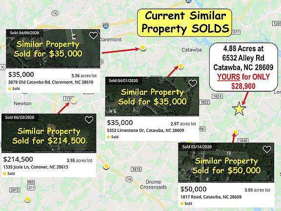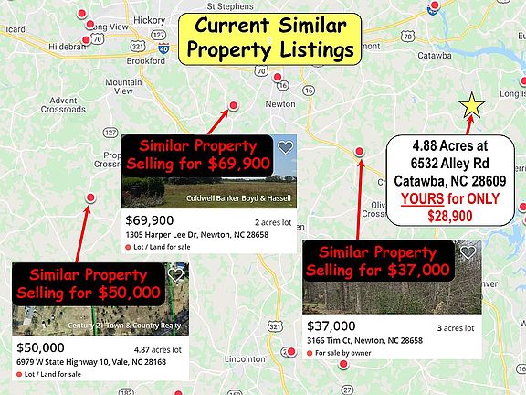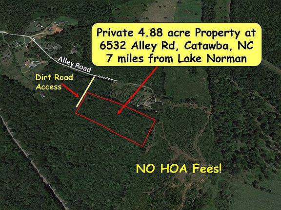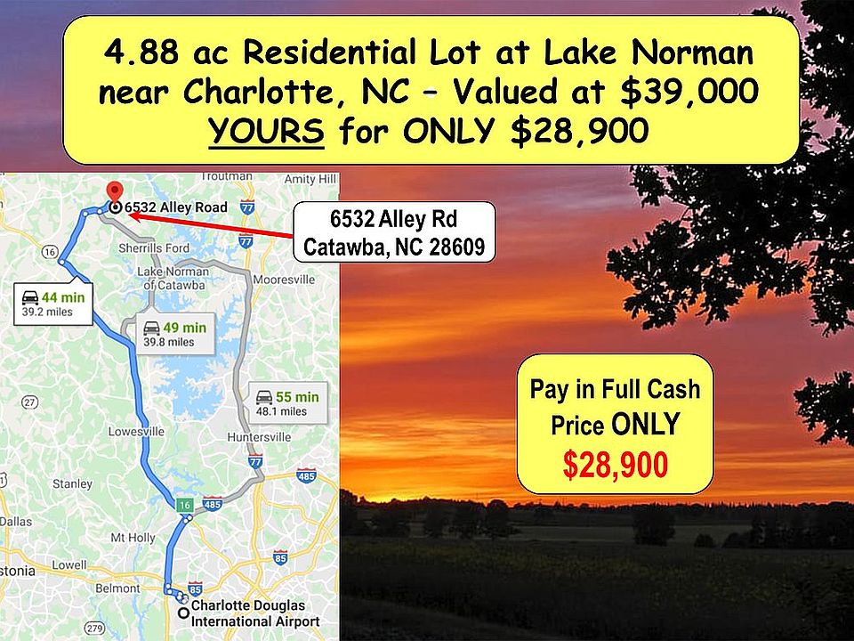 GET OUT OF THE CITY! – NO HOA - 40 Miles from Charlotte NC Welcome to the tranquil world of Lake Norman, North Carolina. This private, 4.88 acre, lushly wooded lot is waiting for you to come play, relax and build some memories. Spend your money experiencing local sites and activities rather than paying annoying HOA fees. Animals OKAY! Not ready to build your dream home yet? Enjoy Camping, RV or Mobile Vacation Home right NOW. Take advantage of quick access to the local marina and ramps less than 8 miles away to launch your boat and explore the treasures of the lake. Similar size lots are listed for $37,000-$69,900 but you can snatch this lot up today for as little as $28,900. Lake Norman: Lake Norman is an angler’s dream and just a quick drive north of Charlotte, NC. It is the largest manmade lake in North Carolina with over 32,000 acres of surface area. MSN News rated Lake Norman one of the top 10 Lakes in the USA outside of the Great Lakes in 2018. Its deepest areas are over 100 feet but it averages a little over 30 feet depth and has over 500 miles of shoreline. Easy access is provided at numerous points for boating and water play. Many waterfront restaurants can be accessed by boat or motor vehicles and range from kick back casual to upscale over-the-top. The Lake host several national fishing tournaments and offers a variety of fish to catch. Weather: Throughout the year temperatures are rarely below 20 degrees Fahrenheit and rarely cross the 95 degree Fahrenheit mark at the other end of the scale. While the weather can be humid in the summer, a quick dip in the lake can chill the heat. The winter may bring a dusting of snow, however the average is only about 3 inches per year. And although the area averages 45 inches of rainfall annually, it also averages over 214 sunny days for your pleasure. Things to Do: Lake Norman is a fisherman’s dream and haven for all types of water play. What? No water toys for the lake? No problem, Cannon Water Adventures, only 10 miles away rents, kayaks, paddle boards, wave runners, boats and everything you’ll need for a day on the water. Ready for more adventure? Visit South Mountains State Park only 40 miles away. This rugged mountain park offers 40 miles of trails and beautiful waterfalls including the incredible High Shoals Falls that plunges 80 feet. While there, cast your fishing rod for some great trout and even spend the night at the campground. If you enjoy less rigorous activities, try your hand at golf or relax with a spa day just 13 miles away at the Rock Barn Country Golf & Spa in Hickory. Locals indulge in being away from it all, knowing it’s only a short drive back to anything else you may desire. Enjoy restaurants, shopping and entertainment within 30 miles and Charlotte is only 40 miles away to splurge your urge for the big city. • Property Type: Vacant Land • Terrain: Rolling hills and lush greenery • Electricity: In the Area • Zoning: R-30 Residential/Animals OKAY • Road Access: Yes – Dirt Road • Annual Taxes: $180 • Septic: Required • Well: Required Buy this property today for just $28,900 CASH! (You save $8,500). Similar properties listed at $37,000+ HAVE QUESTIONS OR READY TO BUY? Purchasing property from us is simple and easy. We always use a 3rd party title company, or closing attorney to make sure our buyers are protected and ensure title is free and clear. Text or call us today to get started. Disclaimer: Buyer will need to work with the County to obtain the proper permits if needed. Buyer will also need to confirm the availability of any utilities needed or serviced on the property. Seller makes no warranties or representations about the land, its condition, or what can be built on the property.