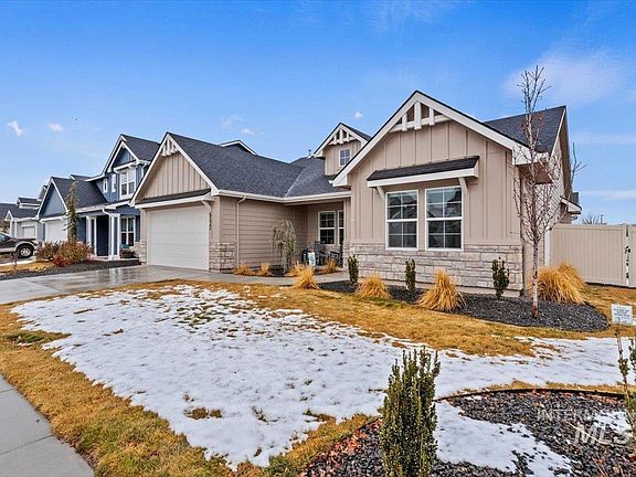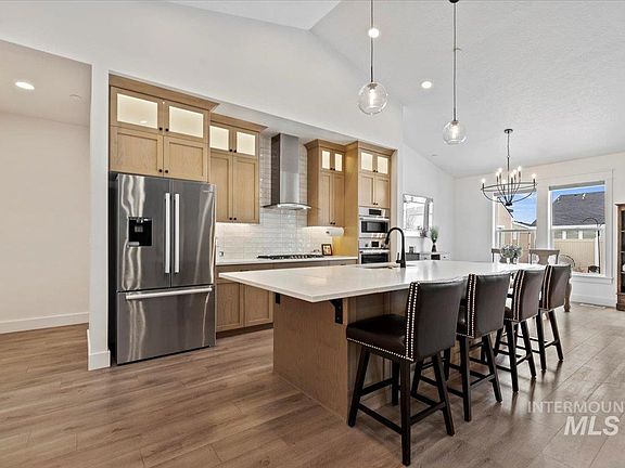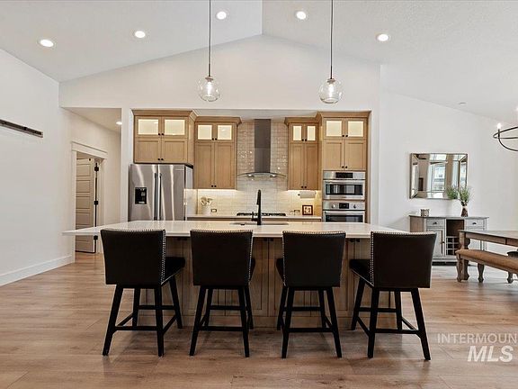 Nestled on a corner lot, this custom, single-level home perfectly captures the best of Southeast Boise’s foothill & mountain views with easy access to hiking trails, Simplot Sports Complex & Lucky Peak. Loaded with upgrades, you’ll love the extra-tall vaulted ceilings, light-toned LVP flooring, craftsman trim, top-down bottom-up shades, fire sprinklers, floor-to-ceiling stack stone fireplace & walls of windows filling the space with natural light. The chef’s kitchen boasts a large island, custom wood cabinetry with soft-close & pull-outs, quartz counters & Bosch appliances, including a 5-burner gas range. The split-bedroom floorplan offers privacy and a separate office/4th bedroom while the spacious primary features vaulted ceilings, a tiled walk-in shower, soaking tub & walk-in closet with built-ins. Enjoy the covered patio & expansive backyard, featuring a WORKSHOP WITH ELECTRICITY and storage, raised garden beds, & views! Oversized 2.5-car garage with storage near the community pool & walking paths too!