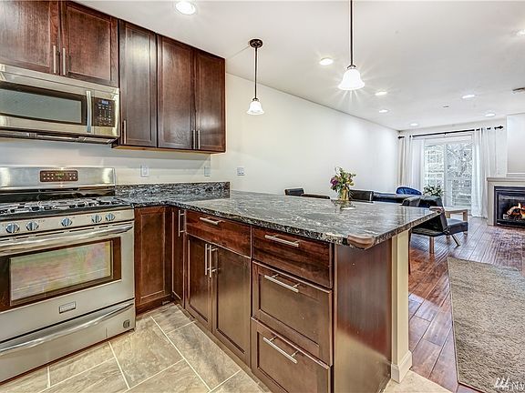 Rare opportunity to find a place so close to Green Lake. Four level townhome just two blocks to the lake on a quiet tree lined street. Not too close to the freeway. Walking distance to coffee shops, PCC, restaurants and transportation. Modern kitchen has granite counters and stainless appliances, walk in pantry. Large living room with gas fireplace and deck overlooking the neighborhood. Each bedroom has a full bath and walk in closet. Large master has jetted tub and shower. Building is sprinklered for fire safety, large one car garage 310 sq ft. for your vehicle. Small rear yard with garden area.