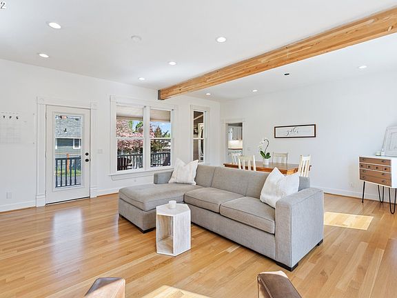 One level, remodeled to create a spacious, open, greatroom floorplan. High ceilings, wood beams, hardwood floors. Spacious kitchen. Light and bright. 3 bedrooms, 2 full baths. Side porch overlooks the large, flat fenced yard and fruit trees. 400sf of storage/shop under the house with walk-in from the back. House was moved to this location in 2010.