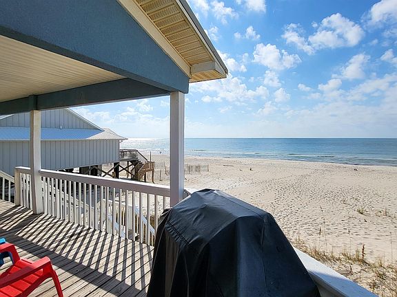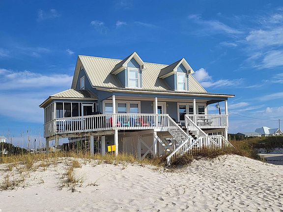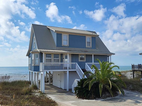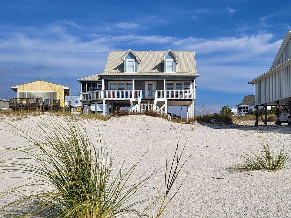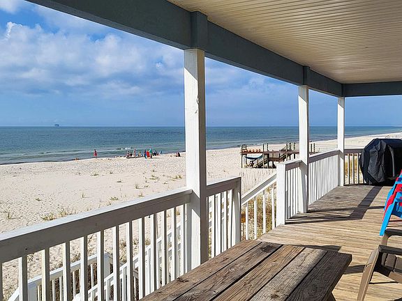 GRAND VIEW! GULF FRONT HOUSE AT END OF STREET. NO THROUGH TRAFFIC TO BOTHER YOU! Great rental revenue, if you're looking for an investment and/or 2nd home. This house has immense amounts of deck and patio area to enjoy the gulf view. Roomy 4 bed, 3 bath with huge gulf view deck and screen-enclosed sitting area accessible to Primary en-suite. Living/Dining and Kitchen areas on main floor along with Primary Bedroom. Laundry room access from Primary. Upstairs you will find the "mirror image" bedrooms that share one of the two centrally located bathrooms. Each of these bedrooms has walk-in closets and attic storage access. The 4th bedroom has bunks. Upstairs and the stairwell are carpeted, while the downstairs is tile and luxury vinyl planks in the Primary. Large storage downstairs with built in workshop benches.