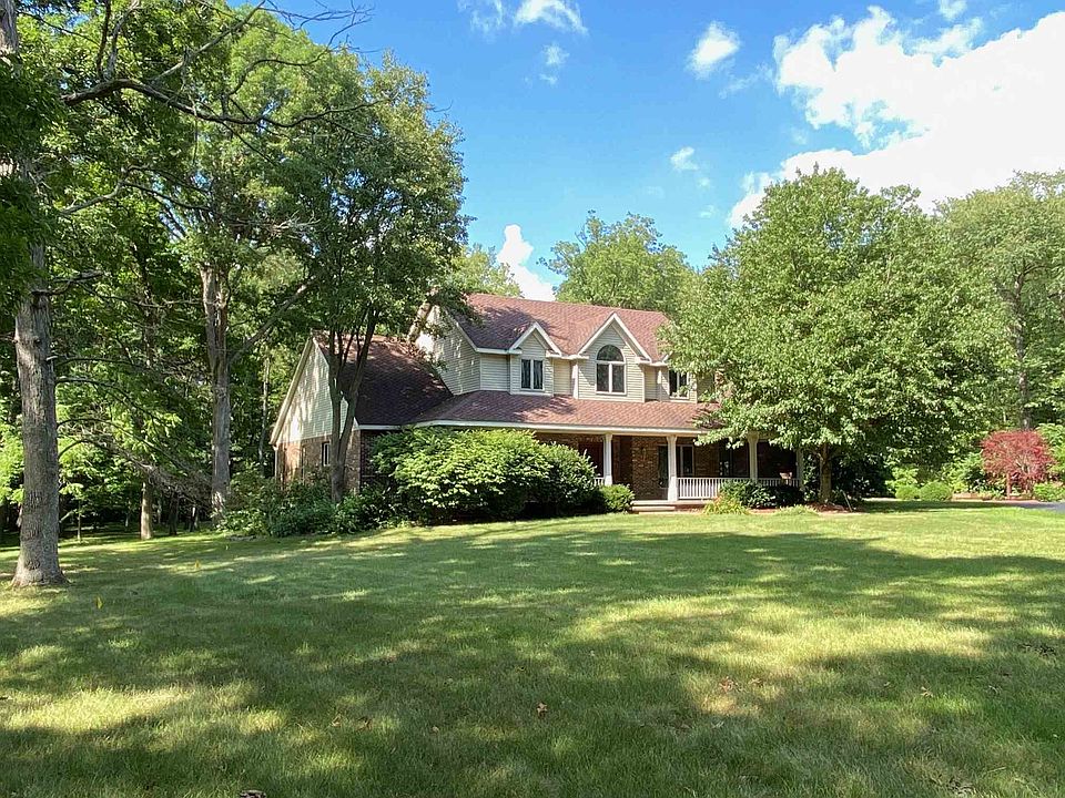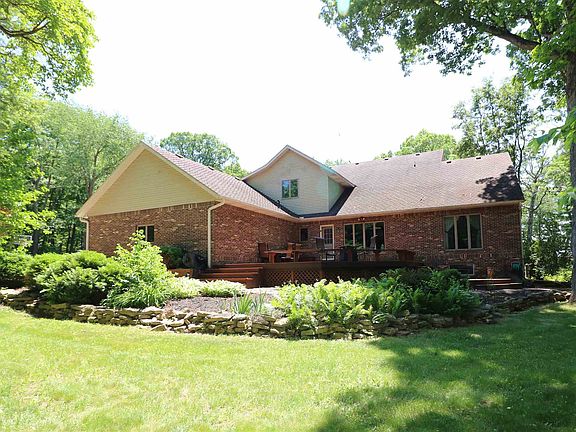 Situated on 5.8 acres and nestled in the woods, this quality built, brick home features vaulted and tray ceilings, solid wood doors, and a custom kitchen. The hardwood floors shine in the open kitchen, breakfast area, and family room where you can cozy right up to the fireplace that can be woodburning or gas log. Four bedrooms, including a main floor master suite, plus an office, three full and two half baths. Large windows offer quite a view of the great outdoors, where you can watch the wildlife parade coming from the woods. The generous backyard deck is a great place to relax and unwind, and the side deck off the kitchen has a dedicated gas line for your grill. The full basement is perfect for the family game room and is easily finishable with some carpet and drywall already in place. A 2-car attached garage, plus a heated 24x32 second garage with a 2nd story offers room for all those hobbies and toys you never had room for. A paved, circle drive and beautiful landscape add the finishing touches to this stately home. Don't wait...you won't find the quality, size of home, garage space, or this gorgeous setting, for this price!