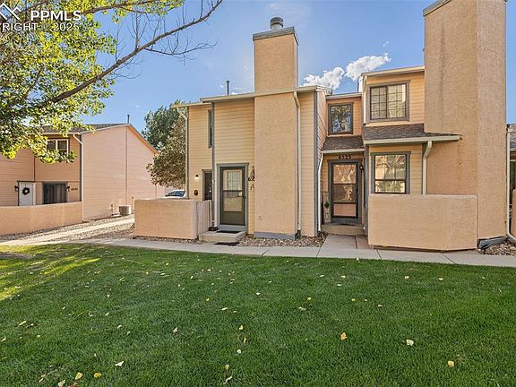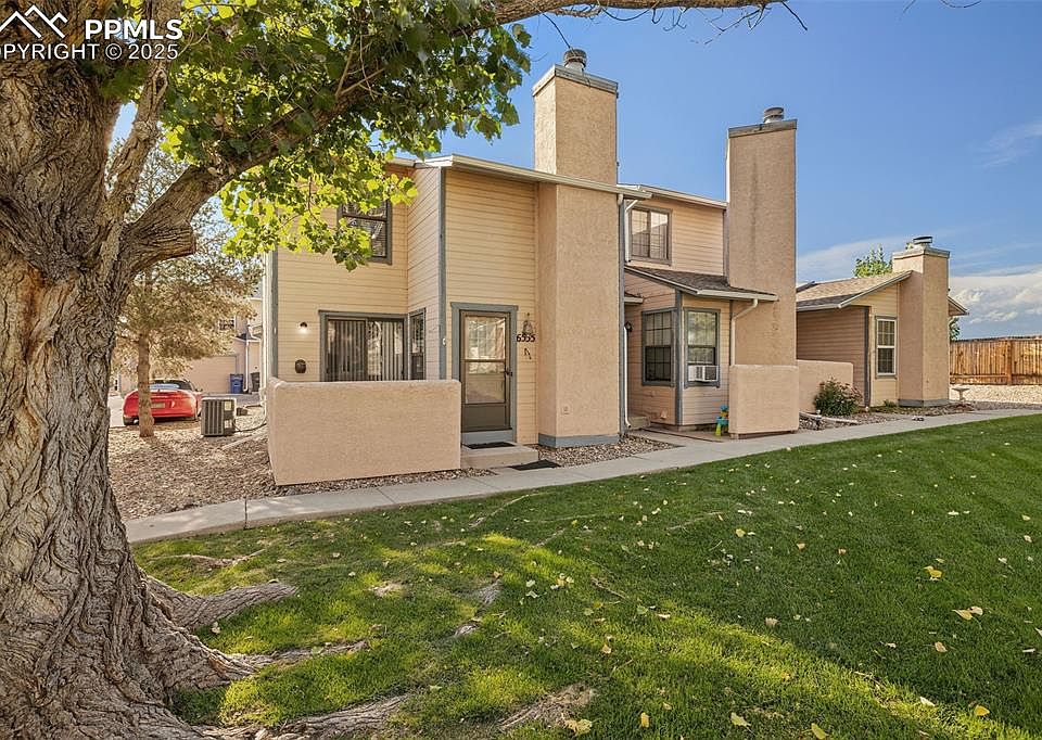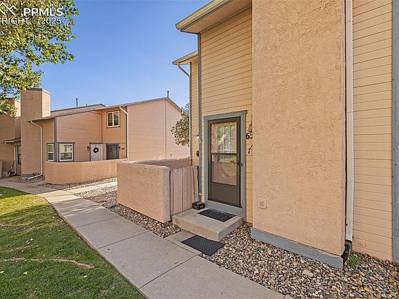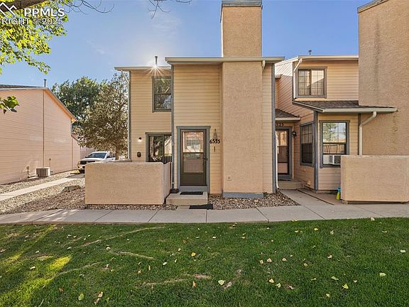 Beautifully updated end-unit townhome offering 2 bedrooms, 2 baths, and a 2 car garage in a convenient, quiet location. The open layout features new hardwood laminate flooring (2024) on the main level, a modern kitchen with plentiful cabinetry, and a spacious loft overlooking the living area w/ vaulted ceilings, adding an airy, open feel. Upstairs offers cozy carpet in the bedrooms and loft, with vinyl in the bath and laundry for easy care. The private stucco-walled courtyard is perfect for grilling or relaxing, and the surrounding mature trees and grassy common area provide shade and privacy. Recent upgrades include hardwood Laminate Flooring & AC Unit in 2024, BathFitters install in 2024, new toilets & sinks in 2023, and new water heater in 2025 Just a 10-minute walk to Widefield Park with pickle ball courts, disc golf, basketball, playgrounds, and ball fields. Conveniently located 5 minutes to Mesa Ridge, 11 minutes to the airport, and offering easy access to I-25 and Highway 24. Move-in ready and beautifully maintained, this home blends comfort, updates, and an ideal location.