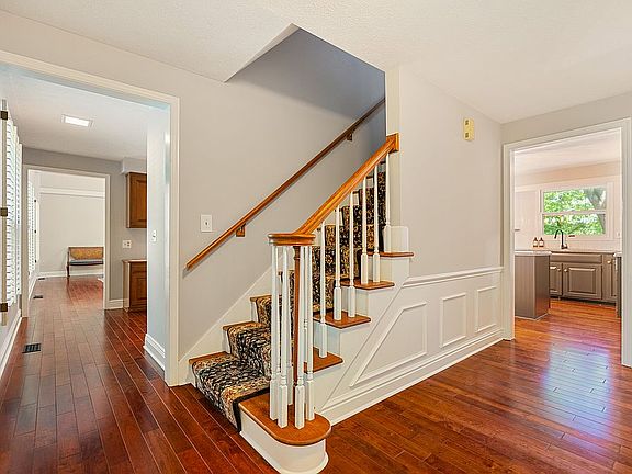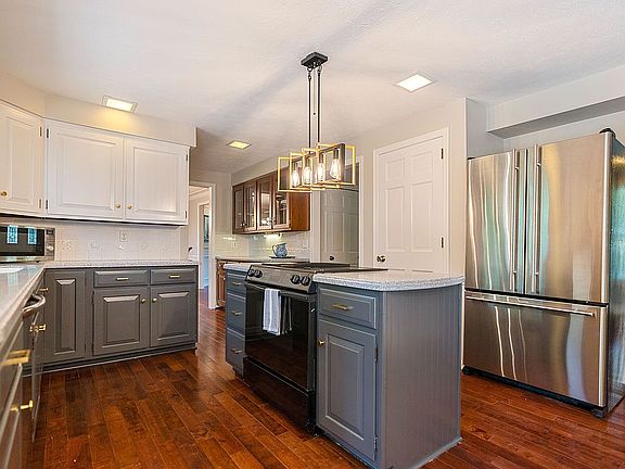 Step into the inviting foyer with cherry hardwood flooring that flows seamlessly throughout the main level. The well-appointed eat-in kitchen showcases a spacious island, ample cabinetry, a large pantry, and a bay window overlooking a brand-new 600 square foot Trex deck. Adjacent to the kitchen, you'll find a convenient first-floor laundry and office space for easy organization. The renovated powder room boasts elegant Restoration Hardware fixtures and lighting.