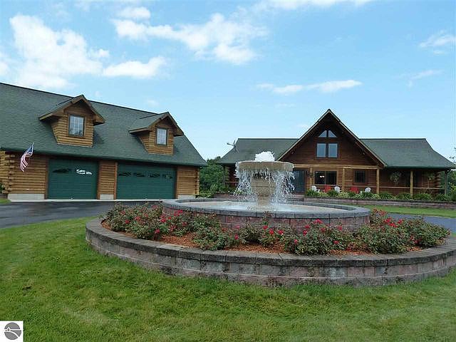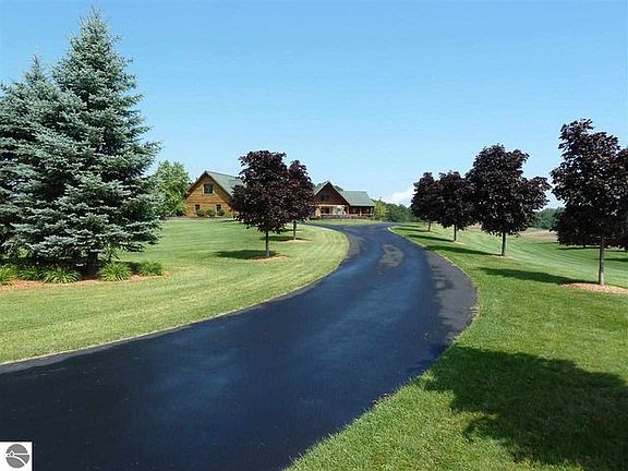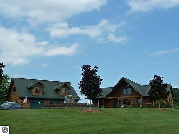 Lovely custom log home on 5 acres with incredible Sunsets just 4 miles to West Bay along with all the amenities of Traverse City. Enjoy a huge great room with vaulted ceilings, floor to ceiling fireplace all opening to a large deck overlooking "pure Leelanau" countryside! Main floor Master suite features a lovely fireplace, Jacuzzi tub and slate dual shower. An upper area den is ideal for a home office. The walkout lower level features a wonderful family room complete with custom bar, multip