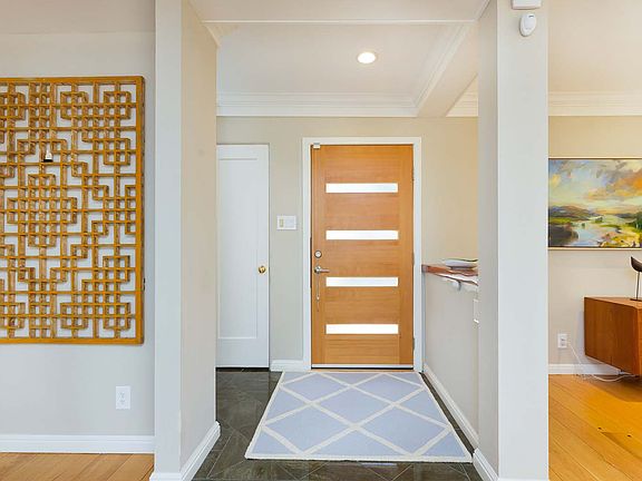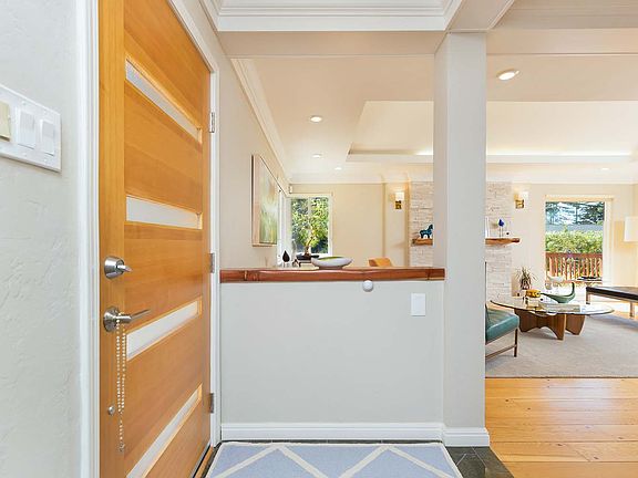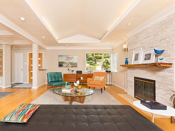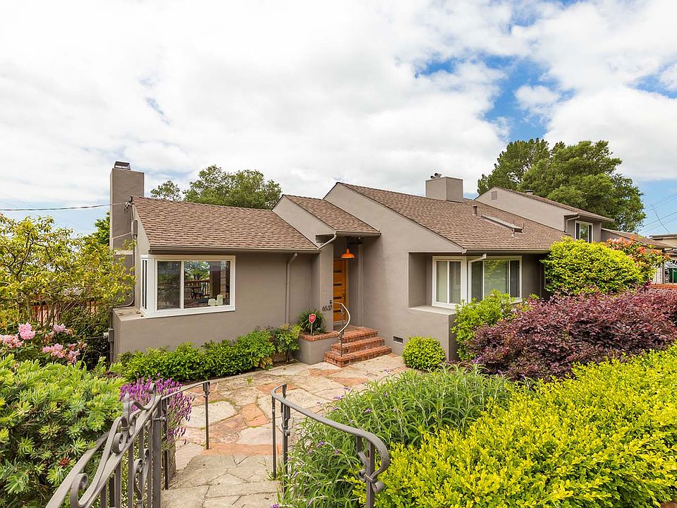 Mid-Century Sophistication in the Montclair Hills. Built in 1945, this wonderful Mid-Century home has been lovingly and thoughtfully remodeled to create the stunning contemporary home that it is today. This truly special home offers formal living and dining rooms, 3 bedrooms, 2 bathrooms, an updated kitchen, a family room, and a 2-car garage. Situated on a spacious corner lot in the East Bay hills, the house is only minutes from Montclair Village; highways 13 and 24; Rockridge BART; and the highly rated Montclair schools. The long, horizontal lines of the home's exterior are complemented by a staggered roofline that gives the house a 21st-century look, and a new contemporary door and large windows on the facade reinforce the modern look. The beautiful landscaping includes copious amounts of colorful salvia, lavender, and azaleas. The gardens show meticulous care and upkeep, and the multiple yards are ideal for anyone who likes to garden or simply enjoys spending time outdoors. The home's beautiful open floor plan is immediately evident upon entering the house. Elegant marble tiles provide a transition from the understated foyer to the striking living and dining rooms that have the original oak floors but are otherwise thoroughly modern. The spacious living room is flooded with natural light from numerous windows including an oversized picture window that overlooks an expansive hardwood deck. The spectacular recessed ceiling includes an inner cathedral ceiling and gives height to the room while recessed lights serve to accentuate the beauty of the architecturally significant ceiling. A horizontal stone fireplace surround and wall cladding are recent additions, as is the beautiful redwood mantel that was commissioned specifically for this fireplace. The impressive dining room has a striking coffered ceiling and a large picture window that symmetrically mirrors the window in the living room. A glass door offers access to the spacious back deck, making indoor/outdoor entertaining a breeze. The elegant eat-in kitchen features granite counters; a soft gray ceramic tile floor; warm honey-colored raised-panel cabinets; and a sophisticated translucent tile backsplash. Premium Frigidaire stainless steel appliances include the gas range, built-in microwave, side-by-side refrigerator, and dishwasher. The eat-in nook has windows on three sides that overlook the deck and offer partial views of downtown Oakland and the SF Bay. The spacious master suite is separate from the rest of the house and located up a half flight of stairs. Sliding doors open to a deck from the bedroom and offer partial views of downtown Oakland. The room features the original bordered oak floor and crown moulding, and a pair of windows provide natural light and ventilation. A very large carpeted walk-in closet is outfitted with handsome built-ins and is spacious enough to accommodate more than one wardrobe. The master bathroom is truly an oasis with a double-sink cherry vanity with a granite top; a built-in linen closet; an English towel warmer; and a travertine-tiled walk-in shower with a built-in bench, rainfall showerhead, and a curved wall set in contemporary translucent mosaic subway tiles. The home's two other bedrooms are situated on the main level on the hallway that leads to the master suite. Both bedrooms are bright and sunny and offer the original oak floors and generous closets with Mid-Century bi-fold doors. An large, elegant bathroom is conveniently located between the two bedrooms and has an oversized vanity with a recessed porcelain sink and granite counter; a walk-in shower; a jetted tub; and a skylight for bright natural light. A special feature of this home is the spacious family room that opens to a landscaped yard. The family room is down a half flight of stairs from a finished laundry room that has a state-of-the-art LG steam washer and dryer; contemporary lighting; and abundant built-in storage cabinets with a sleek European design. 653