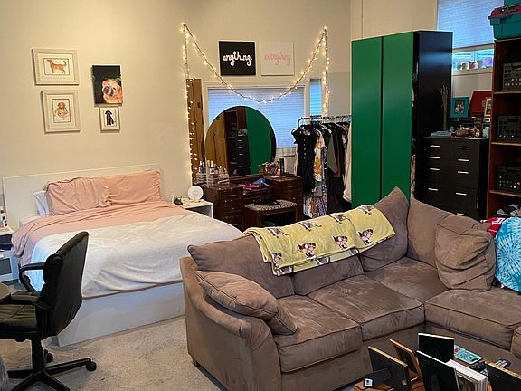 It is a spacious and well-lit 500 sf ADU studio apartment, with tall ceilings and south facing skylight windows. The heat source is a thermostat-controlled wall furnace. There is a complete kitchen area separate from the main living area, which includes an electric stove, microwave, full-sized refrigerator, and decent cabinet and shelf space. The kitchen area also includes stacked clothes washer/dryer. The main living area features ten-foot ceilings, good ceiling lighting and fan, and two separate stand-alone storage units for clothes and storage. There is a full bathroom located off the main living space, which includes a bathtub/shower and built-in shelving. There are two entrances to the unit. One faces the laneway on which the apartment is situated. The other faces onto the main house's patio and side yard, which our tenants are welcome to access and share. Apartment is located 1 blocks from Green Lake, walking distance to coffee shops, restaurants, pubs, pharmacy and PCC grocery. Parking is on street, no permits required. Stops for bus routes 26, 45 and 62 very close by, and newly opened Sound Transit Roosevelt light rail station an easy 10-15 minute walk away. 12 month lease, all utilities & wi-fi included.