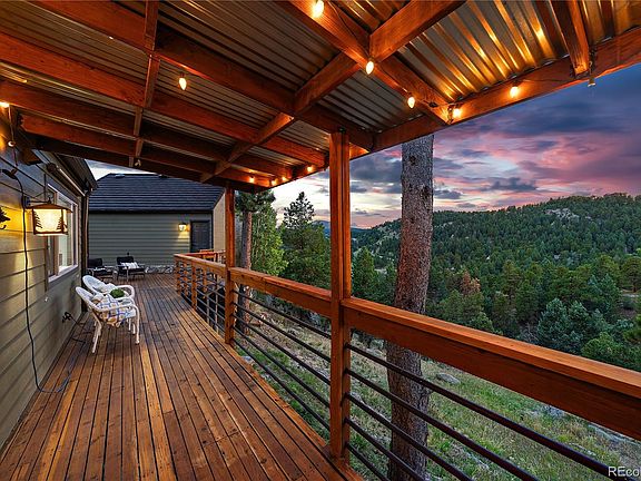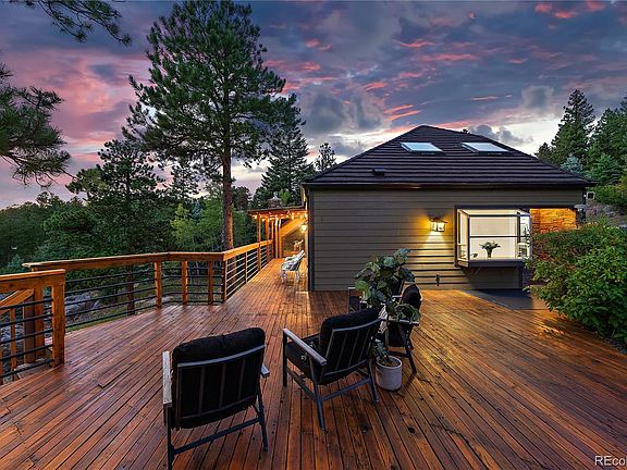 PERFECTLY POSITIONED ON A PRIVATE CUL-DE-SAC ABOVE THE SERENE AND PICTURESQUE COMMUNITY OF EVERGREEN HIGHLANDS, THIS STUNNING 4 BEDROOM, 3 BATH HOME ON 5 ACRES HAS VIEWS YOU WON'T WANT TO MISS!! Easy access with the gently sloped driveway and fresh asphalt brings you directly to the front door! The covered entryway leads to the open, light and bright floor plan with brand new paint, carpet and gorgeous new and refinished hardwood floors! The spacious living room features a striking stone fireplace with a gas insert, vaulted ceilings and ceiling fan!! The eat-in kitchen has granite countertops, new lighting, breakfast bar, double oven, ample cabinet space and an incredible view! A separate dining room with a door to the patio is ideal for family meals or entertaining guests! The main floor powder room has a new vanity, mirror and lighting! A family room with a wood burning stove near a door to the private Trex deck which features more views! Two more bedrooms, full bath and laundry on the main floor! Upstairs, the expansive primary suite includes vaulted ceilings, Hunter Douglas blinds, 5 piece ensuite bathroom with a soaking tub & view of the garden! An additional bedroom, nursery or office space offers versatility and the attached room has remote controlled skylights and rain sensors! Energy efficient features include two furnaces, spray foam insulation, high-end vapor barrier, air sealing, radon mitigation system and a $15k water treatment system. Brand new painted exterior, 50-year metal roof and solar panels! Hand sanded and newly sealed, the deck is ready for all your parties! The two-car detached garage has storage above, a brand new door & a shop area underneath! RV parking with electricity and a large storage shed are huge bonuses! 22 acre community area with a barn, pond, tennis courts & playground area! Progressive dinners & events! Ideal neighborhood for walking! 10 min to local restaurants, 15 min to downtown Evergreen & Lake & only 35 min to Denver!