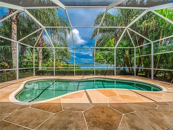 New Price!! Currently the Only home directly on Lake Uiehlein! Edgewater Sound is a gated neighborhood next door to Lakewood Main Street. This 3 Bedroom home with Fabulous Views of the Lake plus your own Dock! Great Room floor plan built by Arthur Rutenberg. Tile throughout Living areas, Crown Molding, Tray Ceiling. Updated Cabinets, counters & sink in Open Kitchen. Separate Dining room & Breakfast room with Large Aquarium window overlooking the Stamped Concrete deck & Heated Pool! Landscaped grounds, Mature Palms & walk down to shared Dock. This Lake allows kayaks, canoes, sailboats & electric motors. Master Bedroom Suite, Extra large Walk-in Shower & Closet, Dual sinks. Split plan provides privacy with 2 other Bedrooms & Bathroom on opposite side. Laundry Room & 2 Car Garage. Well maintained by Original owner, New AC 2019.