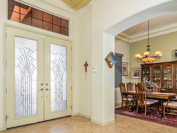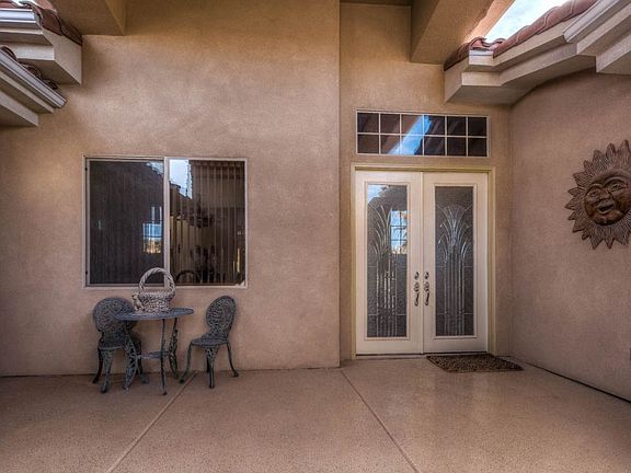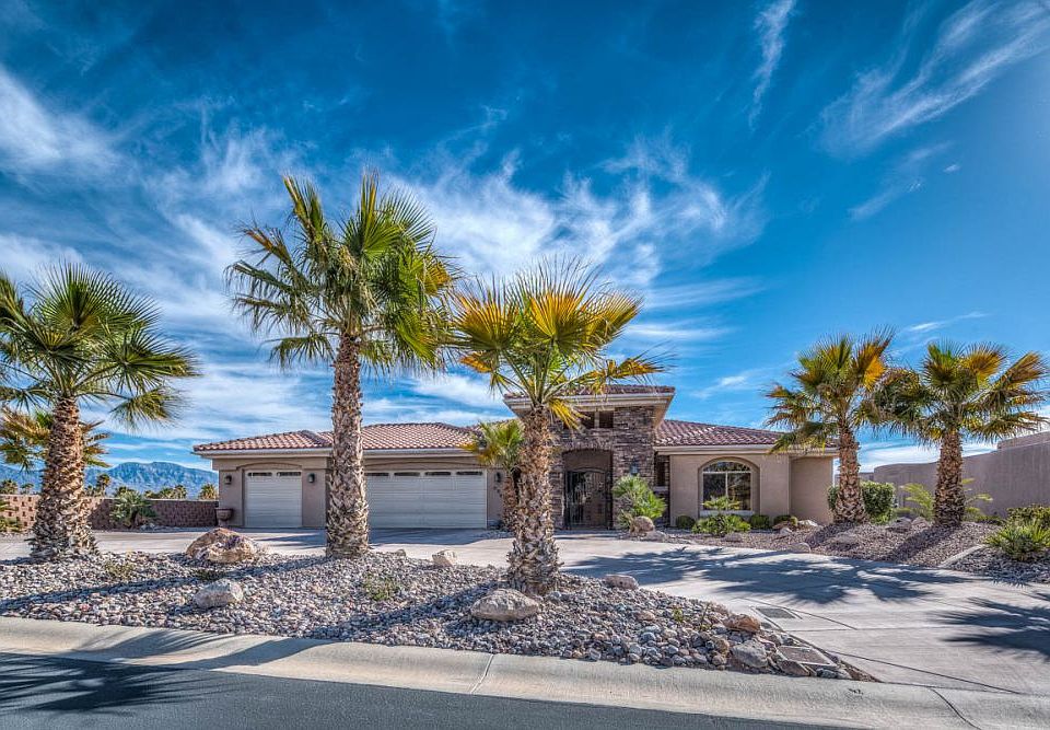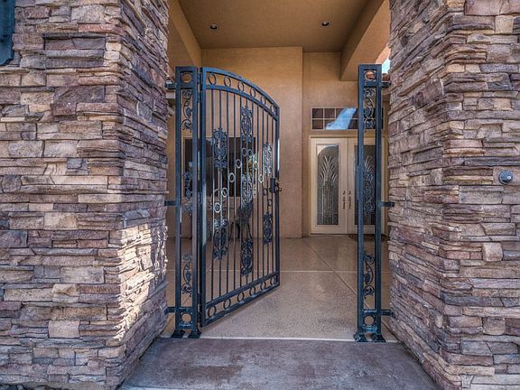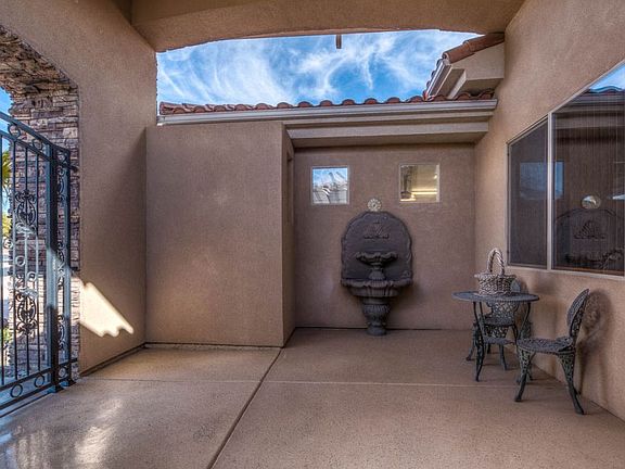 This is a Gem in the Desert, As you approach this beautifully landscaped home with circle drive, you will be greeted by the dramatic, gated rock courtyard entry. Through the etched glass doors you walk right into a spacious, open great room with rock fireplace and gorgeous views right through to the mountains, over the Redd Hills park and lake. Look up when you come in the door and be dazzled by the dramatic, tiffany style chandelier with a myriad of colors. Immediately to the left is the gorgeous dining room with one of a kind alabaster and bronze chandelier, brought from Europe. Immediately to the right is the den/office. Past the Den/office, to the right are two beautiful bedrooms with indirect ceiling lighting from unique soffets, which share a large jack and jill style bath. To the left of the greatroom, past the dining area is a half bath, ldry rm, and luxuriously appointed master suite and bath fit for a queen. Too many luxurious details to decribe! Must come & see! You wont be