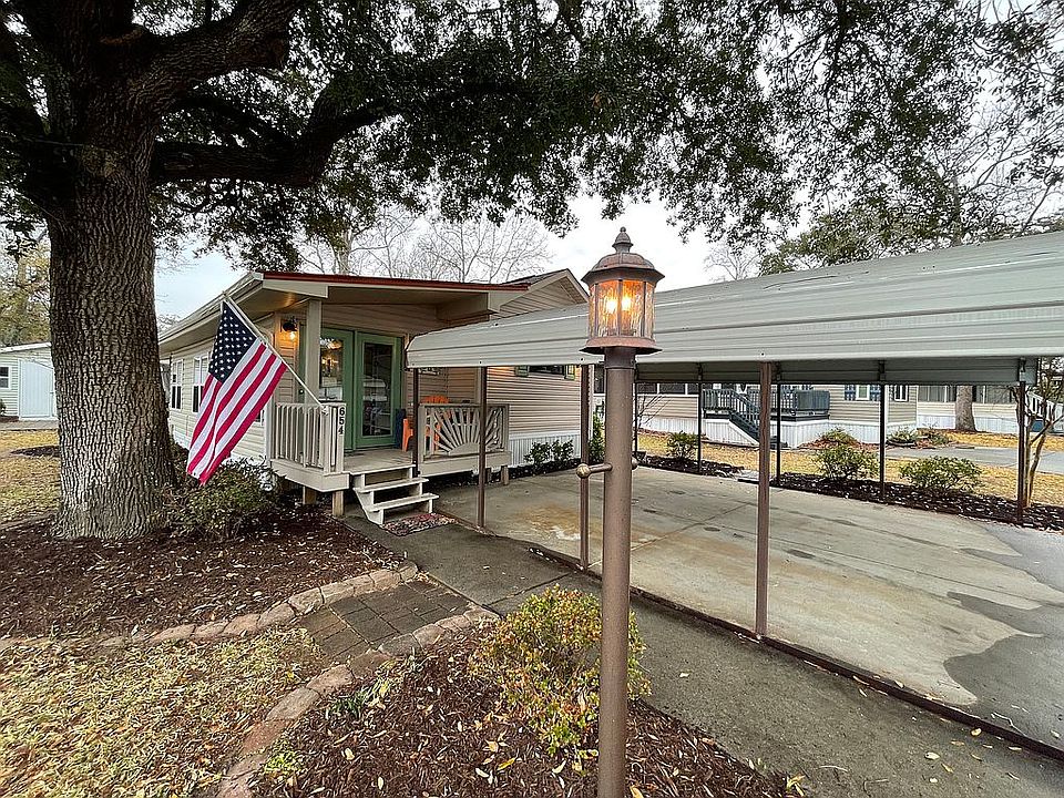 Ever wanted your own home in a beach resort community? This is your chance! This cozy, light filled home located in the Lakewood Resort, just a quick golf cart ride to the beach. The home has an amazing open floor concept. The huge covered back porch allows for social time for when you are enjoying your morning coffee, reading your favorite book, or even having a dinner outside. Covered parking for your own golf cart and the storage shed gives tons of extra space! You don't want to miss this and don't forget all the amazing amenities that come with it, including indoor, outdoor pools, water park with a lazy river, a jacuzzi, mini golf, beach volleyball, bocceball, tennis courts, a trading post which is a all in one general store, where you can shop, eat or just relax and so much more! Many updates to this home. New roof in 2018, New Skirting in 2022, New Foam insulation in the crawl space in 2022, New Moisture Barrier in 2022, Updated Quart Counter Tops and glass backsplash. New Luxury Vinyl Flooring in 2022. Schedule a showing today!