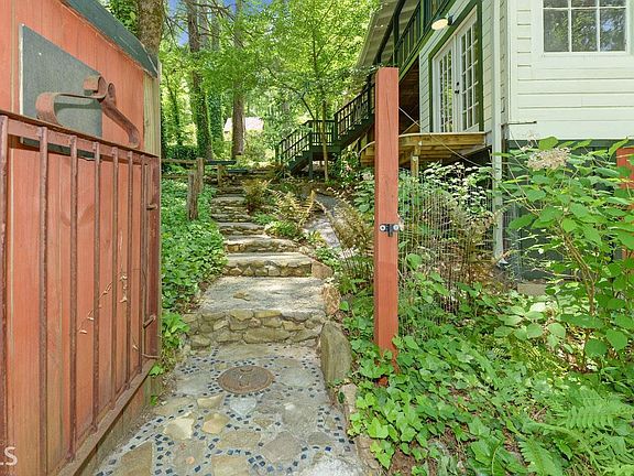 Originally constructed in the 1920s, this lovingly renovated cottage was once known as 'Prescott Lodge', a hunting and fishing retreat. Once you step onto the large wraparound 'rocking chair' porch, you get a sense of years spent relaxing here. Step inside to an entry-way and dining area with vaulted ceilings and built-in bookcases. The main living area offers vaulted ceilings with exposed wooden beams, a large, stone fireplace and cottage kitchen. The master suite has lofty ceilings and a private bathroom with separate tub and walk-in shower. Two guest rooms share a common bathroom. This home also boasts a full mother-in-law suite with bathroom and kitchen on the ground floor. Stone footpaths with quirky artistic details lead to terraced gardens, a cottage greenhouse, grill pavilion and parking. Located only minutes from Lake Rabun and Seed Lake!