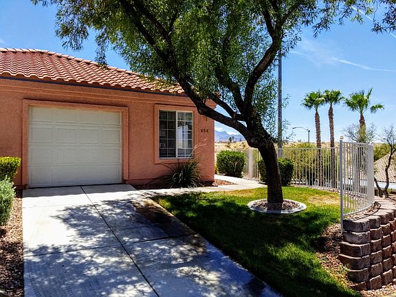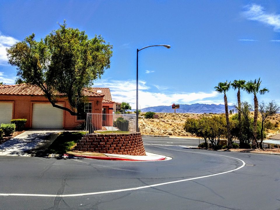 One of the best locations for views and privacy in the Crossings. AWESOME VIEWS! One car garage, Bonus Room off the garage in addition to the 2 Bedrooms and 2 Baths inside. High Ceilings, Light and Bright with big skylight in the spacious open kitchen. 2 sided fireplace in living room & master suite. Great location end of the row home sits on high elevated lot, over Mesa and Peartree. Back patio faces the southern and eastern mountains. Whole west side of the home and bonus room have beautiful west views for spectacular sunsets and night city lights. Beautiful, move in condition. Immaculately maintained. Great hoa in this community maintains all landscaping, insurance, trash, cable tv, beautiful common areas, pool, spa, rec room with pool table, kitchen, open group party room, and fitness area/gym. Mature, beautiful landscaping and ample guest/extra parking. For ATV fans, this is a great location with an open access to the open desert right at the end of Mesa Blvd... less than a quarter mile up the street. Great for desert walks, ATV, exploring. For Casino action, just down the street, you have the Eureka and Virgin River Casinos. Yes, you can have it all at a great price.
