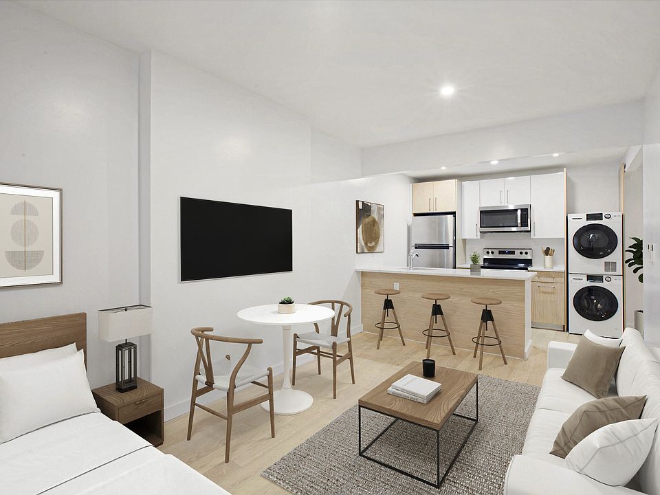Enjoy central heat, a video intercom system, and exposed brick throughout the space. The apartment features hardwood floors, a modern kitchen with stainless steel appliances, a dishwasher and microwave, and an in-unit washer/dryer for your convenience.