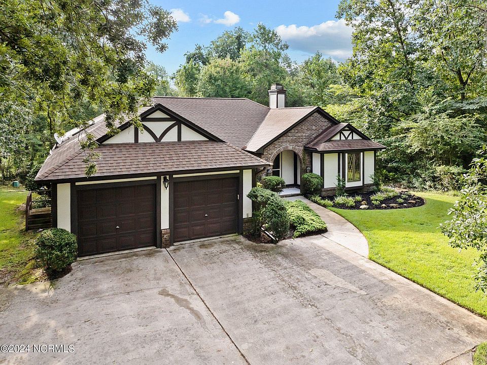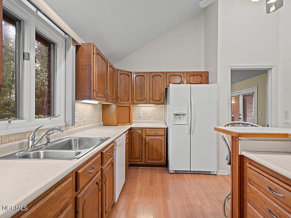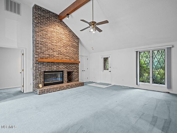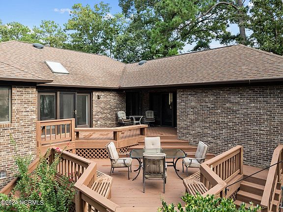 Nestled on a quiet road in the desirable Olde Point neighborhood, this beautiful 3 bedroom, 2 full bathroom home spans 2,239 square feet and offers a serene retreat surrounded by lush greenery and mature landscaping. The two-story living room features vaulted ceilings, exposed wood beams, and a stunning oversized brick fireplace. A sunroom with skylights provides a perfect spot for relaxation. A beautiful dining room boasts chair rail molding with archways leading to the well-appointed kitchen, featuring a newer refrigerator (2023), a brand-new stove (2024), a high-low island for additional seating, and a pantry, alongside a separate wet bar for convenient entertaining. The sizable master suite offers two generous walk-in closets, private porch access, and a luxurious en-suite bathroom with two separate vanities, a makeup vanity, a giant jetted tub, and a walk-in shower. Two additional bedrooms and a second full bathroom are on the opposite side of the home for added privacy. A large laundry room with a utility sink leads to the spacious 2-car garage, which features a full shower and ample space for a work table. The outdoor living area is a true highlight, featuring multilevel decks overlooking the tree canopy, perfect for entertaining with family and friends or relaxing. Excellent views of the 3rd and 9th fairways in the winter, with lush foliage providing privacy in the warmer months. A large basement serves as a workshop or storage space. Additional features include a portable generator hookup, a 2022 heat pump, a 2022 roof, a 2020 hot water heater, a Trane HVAC system, and 400 amps of service. City water and septic on site. Residents of Olde Point enjoy deeded access to the Intracoastal Waterway via a nearby boat ramp at the Harbor Village Yacht Club. The community also offers a high-class golf course, pool, tennis courts, clubhouse, social events, and more, all within the esteemed Topsail school district. Call today to make this beautiful home yours!
