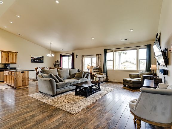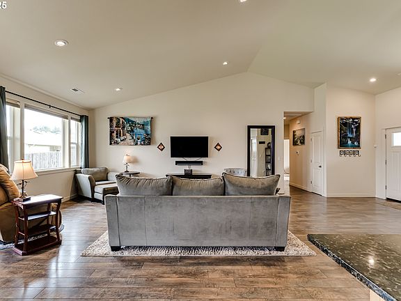 Beautiful and modern 3 bed, 2 bath home conveniently situated on the outskirts of Cottage Grove. Great room concept with kitchen open to the dining and living areas. Vaulted ceilings add to the appeal. Kitchen has custom hickory cabinets, stainless steel appliances and granite countertops - which also feature throughout the home. Primary bedroom with vaulted ceilings and walk-in closet. Primary bathroom has double vanities. Recessed entry at the front of the home to shield from the elements. Spacious and fully fenced back yard has been enhanced with appealing hardscaping. Covered rear patio offers a great space for entertaining. Easy access to I-5 and the many amenities available downtown.