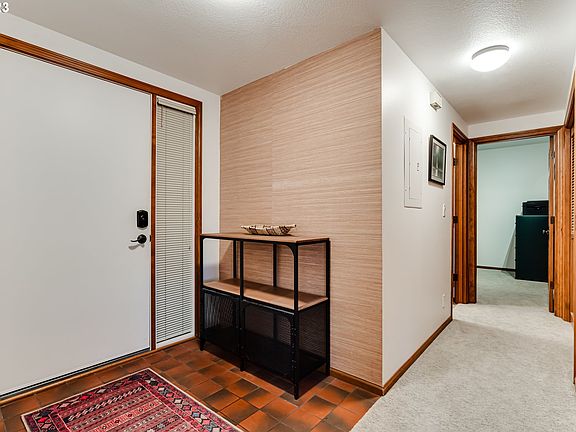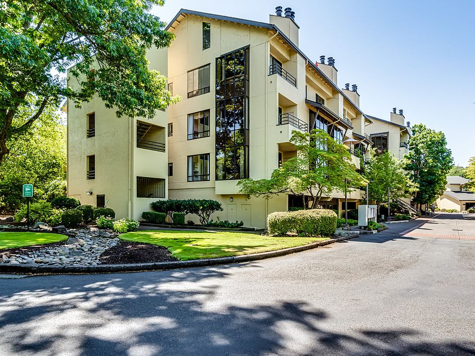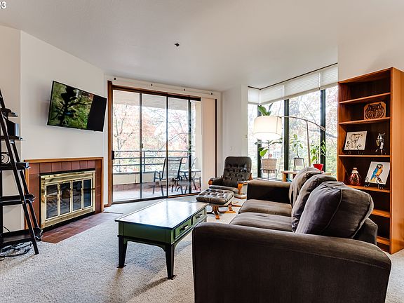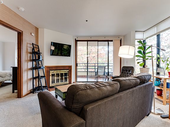 Beautiful single-level 2 bed/2 bath condo on the main floor of the River Island Estates mid-rise building. The floor plan is light filled and open with a wood fireplace in the living room and bountiful windows. Enjoy your morning coffee on your own private balcony. Kitchen has plenty of room for multiple cooks and bountiful cabinetry. The primary bedroom features a private bath and roomy walk-in closet. Another notable convenience is the inside laundry. The modern building offers many amenities including secure entry, elevator, bike storage and ground level parking. The inner courtyard offers high ceilings and beautiful vegetation giving it a park like feel. Moments away from the Willamette River, parks and the miles of paved and unpaved paths. This location is near shopping and a bus line. This condo is a must-see!