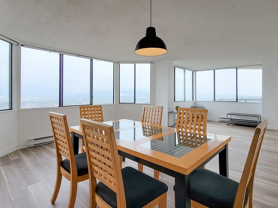 Near top level concrete condo with panoramic Northeast and South views. Huge space of near 1200sf. Updated flooring, paint, appliances and lighting. Building updated elevator and common areas. One of the best value in Metrotown. 1 secure underground parking. 1 secure spacious storage locker. Walk to Royal Oak Skytrain station. Walk to Metrotown.