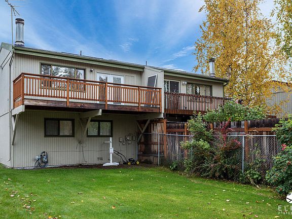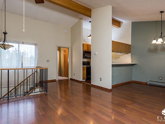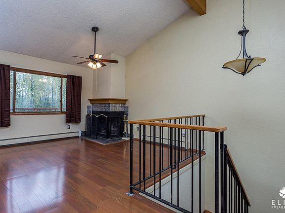 Laminate wood flooring with new paint and carpet throughout. View of Cheney Lake, deck, shed, and fenced yard. Vaulted ceilings with fireplace, newer stove and microwave.