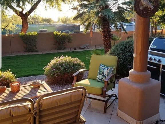 Monthly lease has been reduced for summer rate, starting 07/01/2025 thru September 30, 2025. Gorgeous town home, located in The Rock. End unit next to pool & spa. Fully furnished, with linens, bedding & towels, fully stocked kitchen. Primary bedroom has large walk in closet with custom shelving system & walk-in shower in primary bathroom. Dual sinks are featured as well. Second bath has tub/shower combo. Home features granite counter top, eat up bar, dining area, RO system, water softener, laundry with pantry cabinets. Home features stone flooring throughout. Every window, as well as sliding glass door has wood shutters. Second bedroom has built in desk, cabinets and outlets for home office. Den has a Murphy bed wall system. HOA maintains front landscaping and common area in back of home. Covered patio is perfect for morning coffee, relaxing or enjoying evening sunsets. Located across from Red Mountain CC driving range. Located in gated community inside of Red Mountain Ranch community. This home is perfect for winter visitors to enjoy Arizona gorgeous winter weather! Basic Cox Cable TV is provided. Renter to pay for utilities/ internet. HOA dues are paid by owner. Fully furnished, kitchen is stocked, linens are provided. Home has covered patio with new cushions on patio furniture. Grill is provided as well. Home is end unit and sits next to community pool & spa. Home is located in the Red Mountain Ranch community, right across from the driving range. Summer rate of $1995 for the months of July, August & September. Monthly rent will go back to $2495 starting October. 6 month lease and then month to month starting January of 2026. Please contact lister for details.