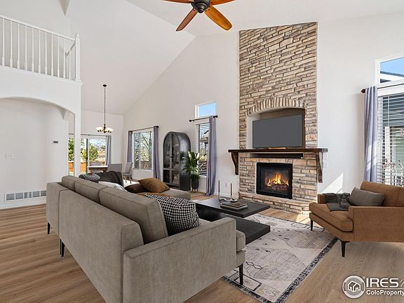 This stunning Wellington home is a true showstopper, boasting huge windows that flood the space with natural light and perfectly frame the breathtaking mountain views. The vaulted ceilings add a grand sense of space, while brand-new LVP flooring and fresh interior paint provide a modern touch. The kitchen is a dream with gorgeous granite counters and rich knotty alder cabinets, perfect for entertaining or everyday life. The main-level primary suite features a luxurious 5-piece bathroom and spacious walk-in closet. Upstairs, two large bedrooms, a versatile loft and Jack & Jill bathroom offer added functionality. Cozy up by the floor-to-ceiling stone gas fireplace or unwind on the back patio or charming front porch. The heated 3-car garage is ideal for winter mornings, and the HOA even includes non-potable water to keep the lush landscaping vibrant. With a newer furnace and tankless water heater, plus an unfinished basement ready for your vision, this impeccably maintained home is a rare gem! Pre-inspected for Buyer's peace of mind.