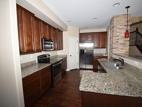 This beautiful home will treat its tenants to a variety of features. A tiled floor entry transitions to dark wood laminate flooring that covers the kitchen, dining area, and living room on the main level. The kitchen features granite counter tops, corner pantry, a breakfast bar, and stainless steel appliances. The living room is equipped with wiring for 5:1 surround sound, a fireplace with built-ins on each side, and a walk-out to a concrete patio. The upper level features 3 bedrooms; each containing a walk-in closet and ceiling fan. A laundry room, full bath, and master bedroom are also located on the upper level. The master bedroom has a tiled 5 piece bath, soaking tub, and a spacious walk-in closet. The finished basement is adjoined with a sizable family room, a bedroom, and a full bath with tiled flooring and granite countertops.