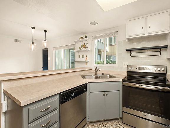 Move-in ready single-level College Area condo features an updated kitchen with modern finishes and an eat-at counter. The bedrooms are located on opposite sides of the unit for added privacy, and both bathrooms have been tastefully remodeled with quality finishes. A full-size side-by-side washer and dryer are conveniently located in the unit. Enjoy the private enclosed patio and custom dining area lighting that adds warmth and character. The extremely well-maintained complex offers a pool, jacuzzi, and dog park. One assigned parking space is included, along with plenty of guest parking. Ideally located across from a shopping center with stores, dining, and banking, and just minutes to SDSU and Lake Chollas, with quick easy access to the 94 freeway around the corner.