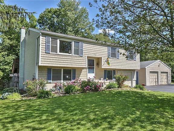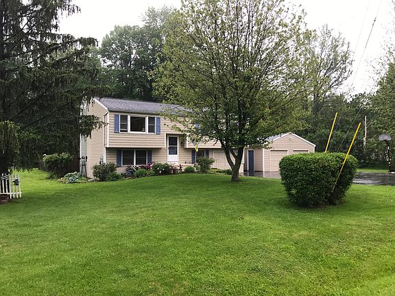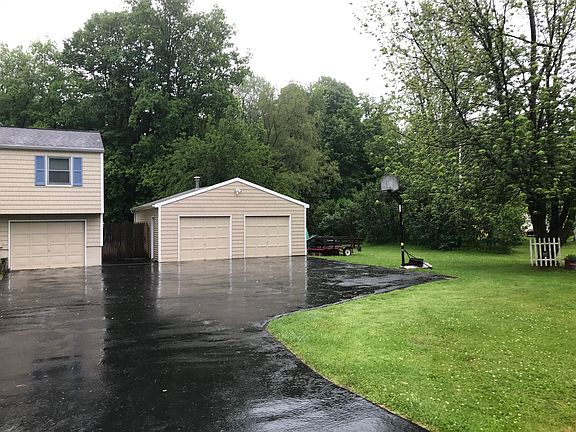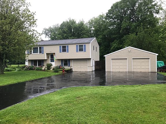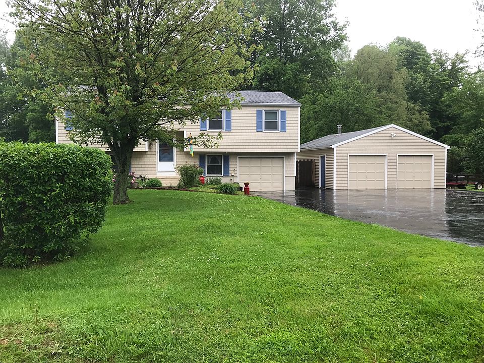 Great space and yard - close to all! Open 1st floor living - 3BR and full bath on main level. Finished lower level has family room and office/den area- could easily be a 4th bedroom if needed. Laminate flooring. Soft yellow cabinets in kitchen with breakfast bar. Dinette area with Sliders to deck. Laundry/utility room lower level. Family room with stone surround wood stove-wood accent and door to Patio/fantastic yard! Attached 1 car garage access. Full walk out to concrete Patio and oval above ground pool (2016). Fenced yard. Additional detached 2+ car garage - great space for car enthusiast -or work shop space. Has own electric service. Perfect home to spread out!